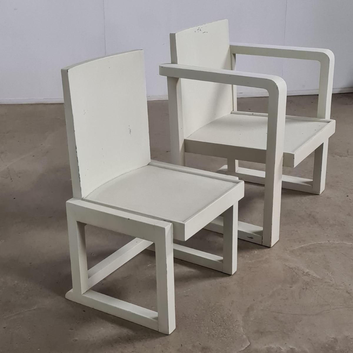 2 chaises modernistes, probablement du nord de l'Europe (Belgique, Hollande), début 20ieme siècle. Peinture blanche/grise ancienne recouvrant un bleu d'origine visible sous l'assise. Du même auteur donc à vendre ensemble. Rare.
