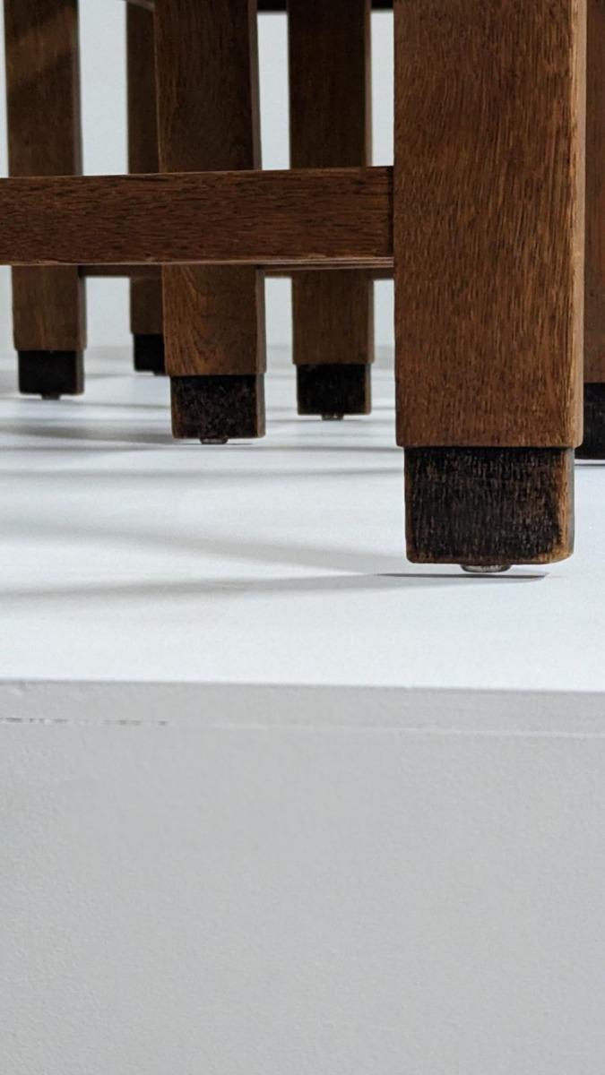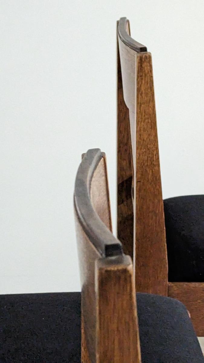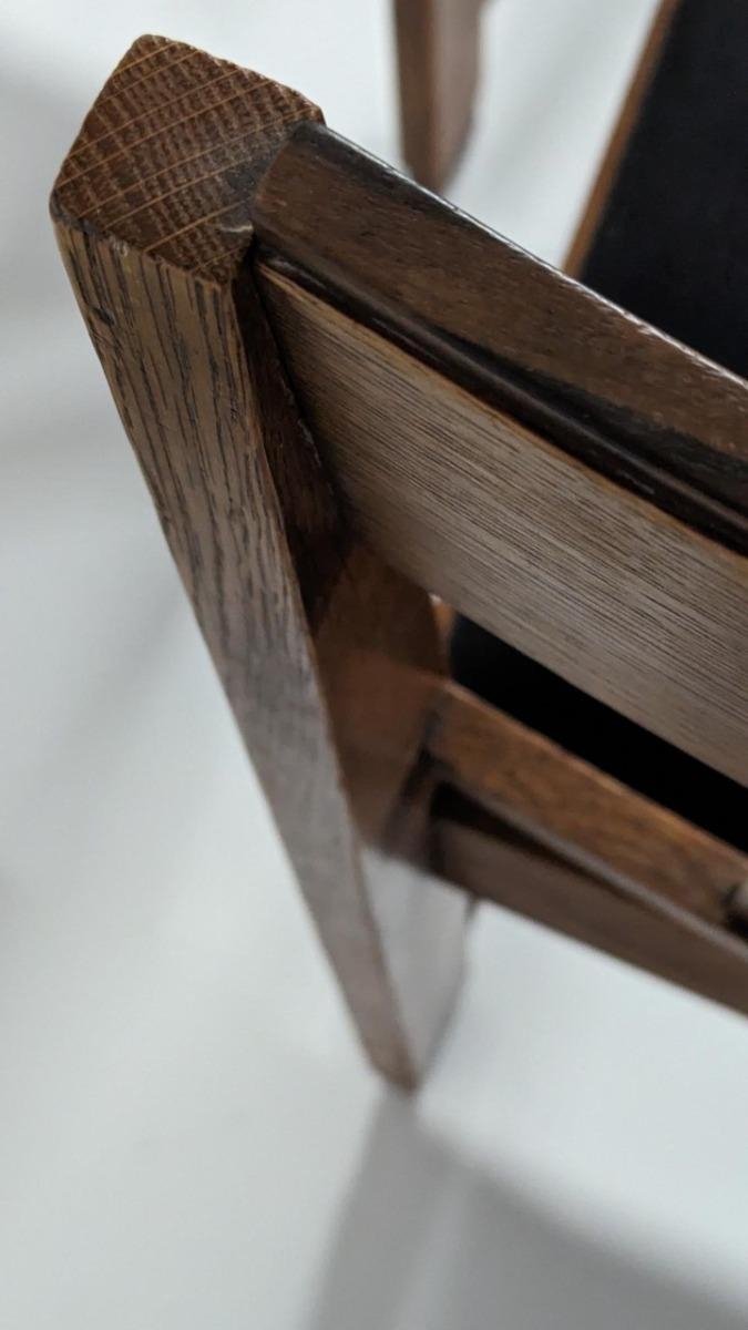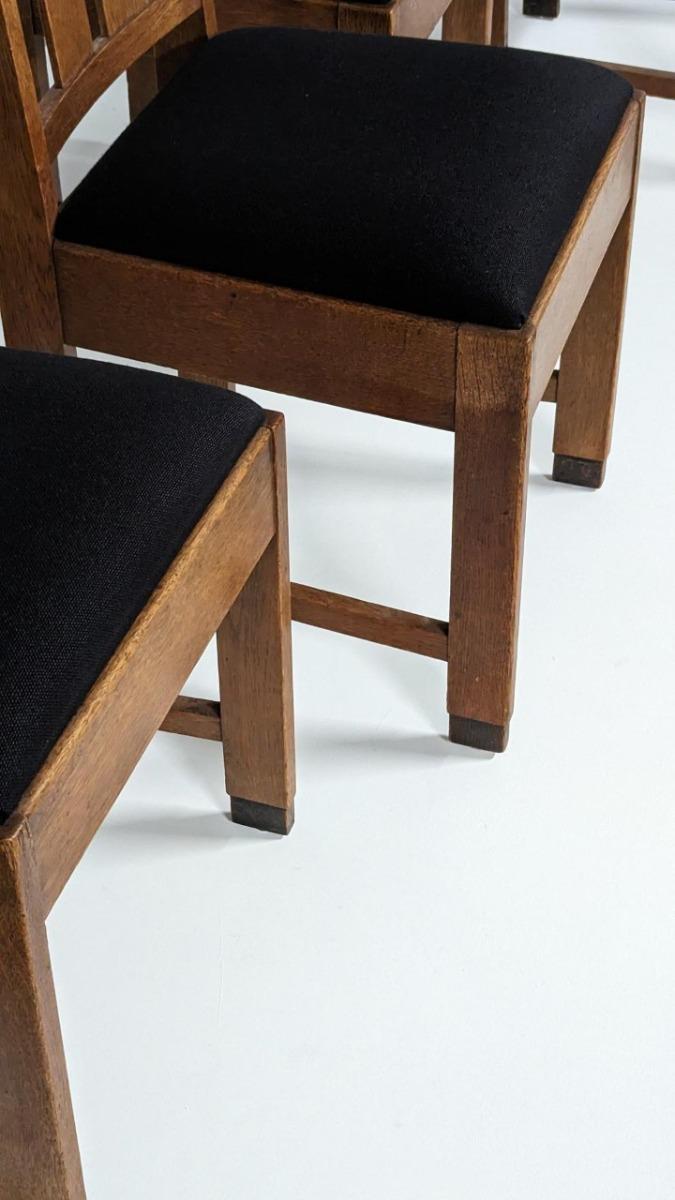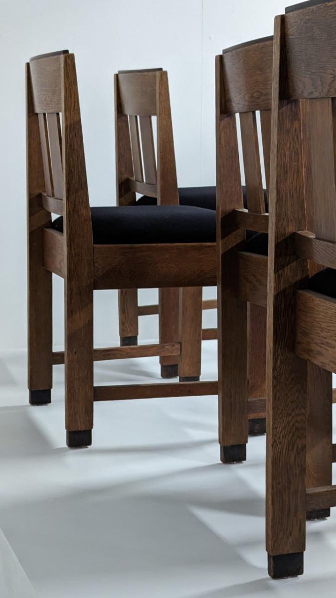 4 chaises dites de l'école d'Amsterdam, vers 1910. En chêne, assises refaites d'un tissu bleu marine. Haut assise 50cm