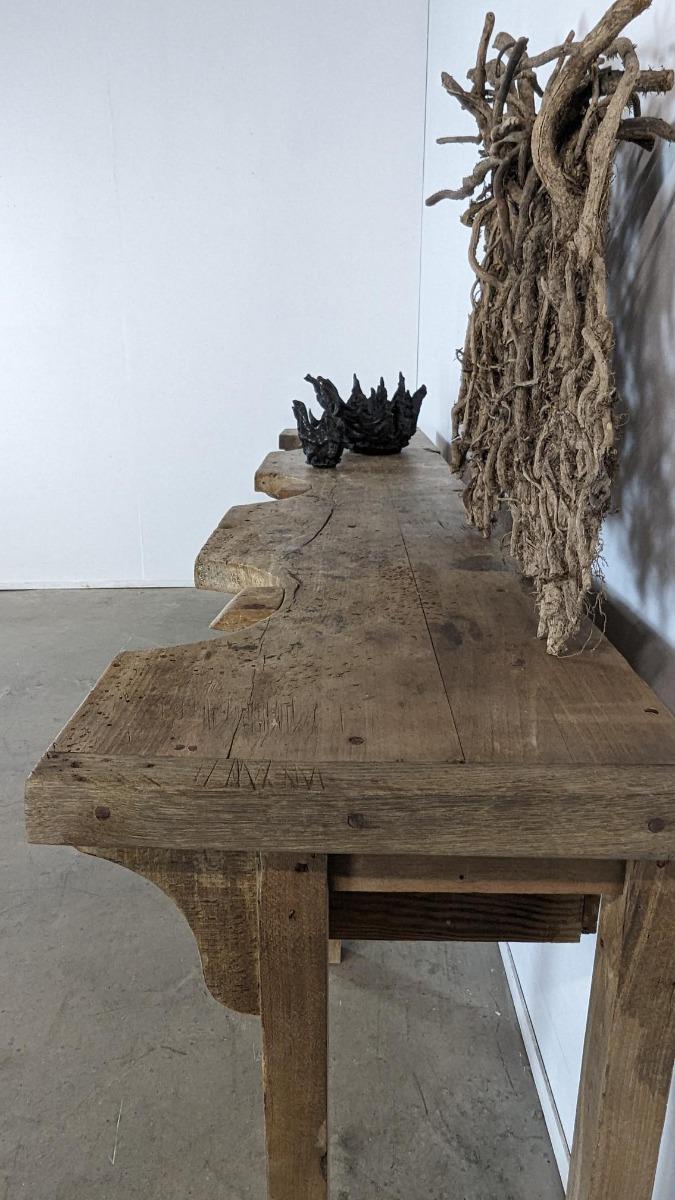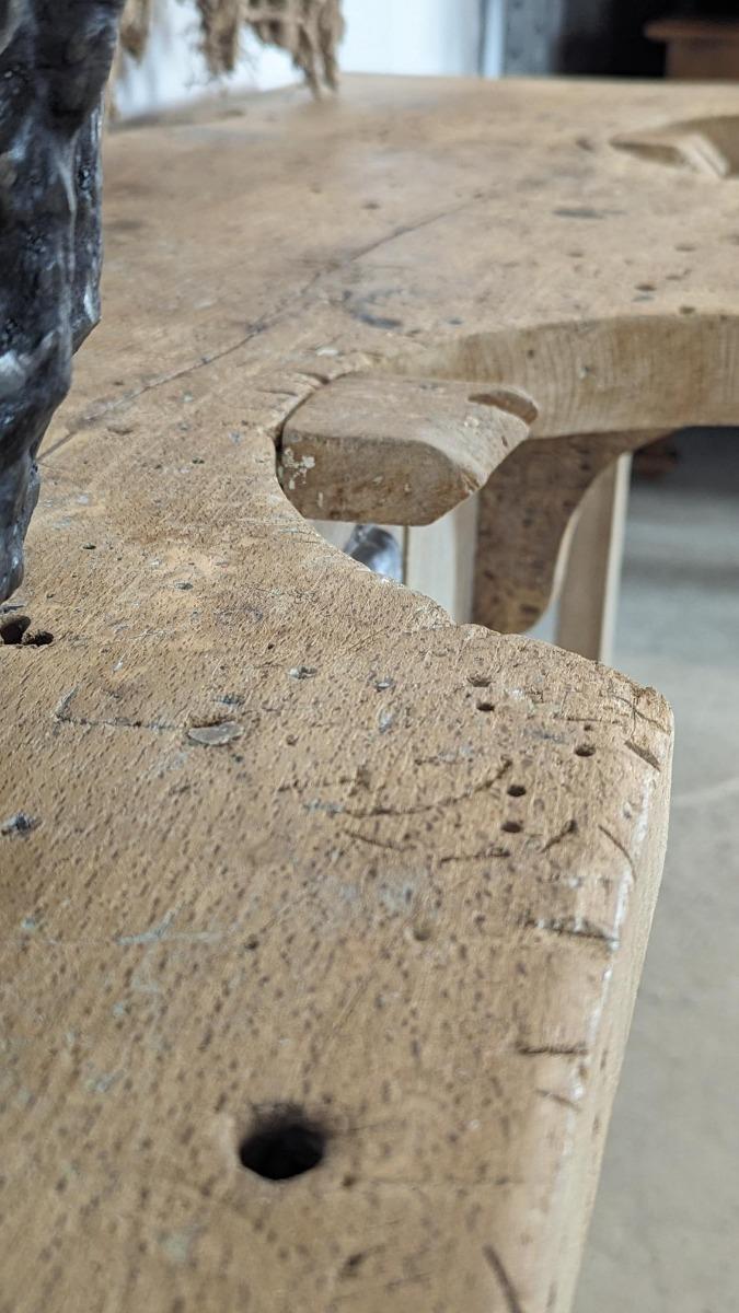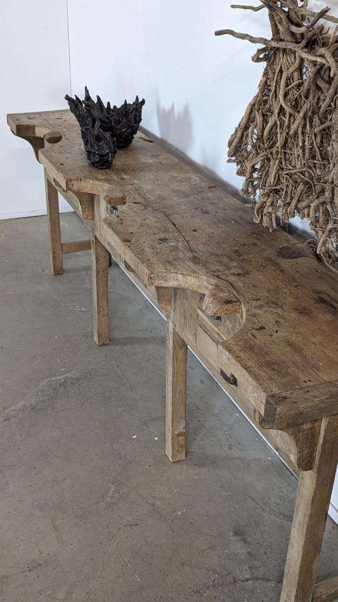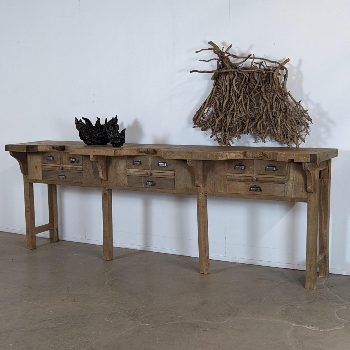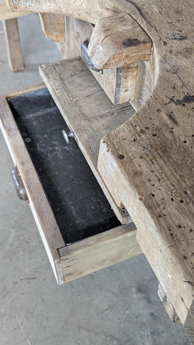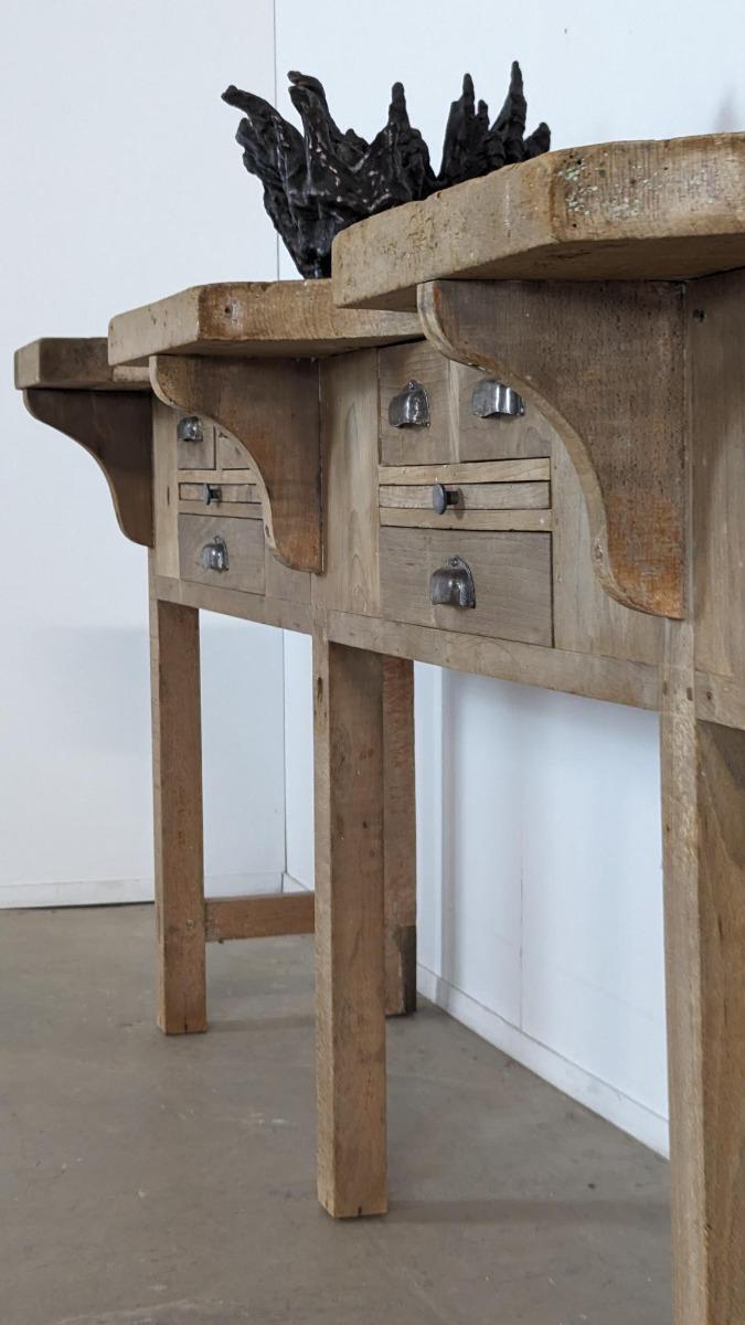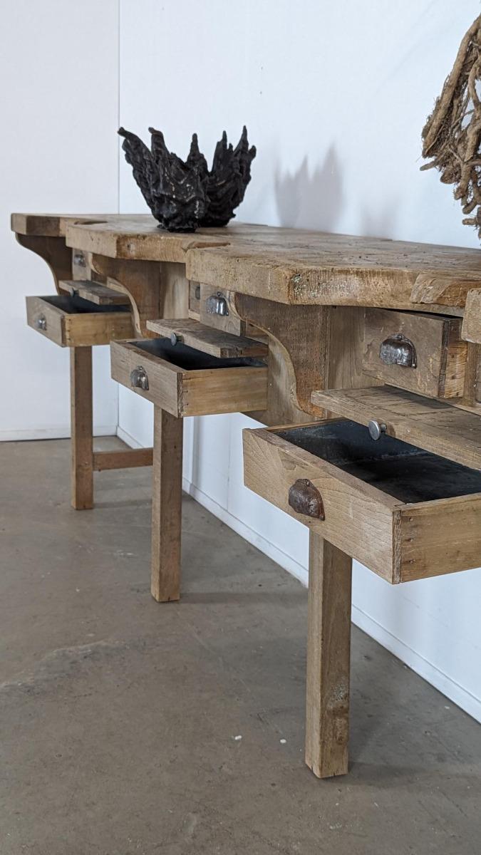 Longue console, ancienne table de travail de bijoutier. Hêtre, vers 1950. Jolie patine, 3 tiroirs habillés de zinc