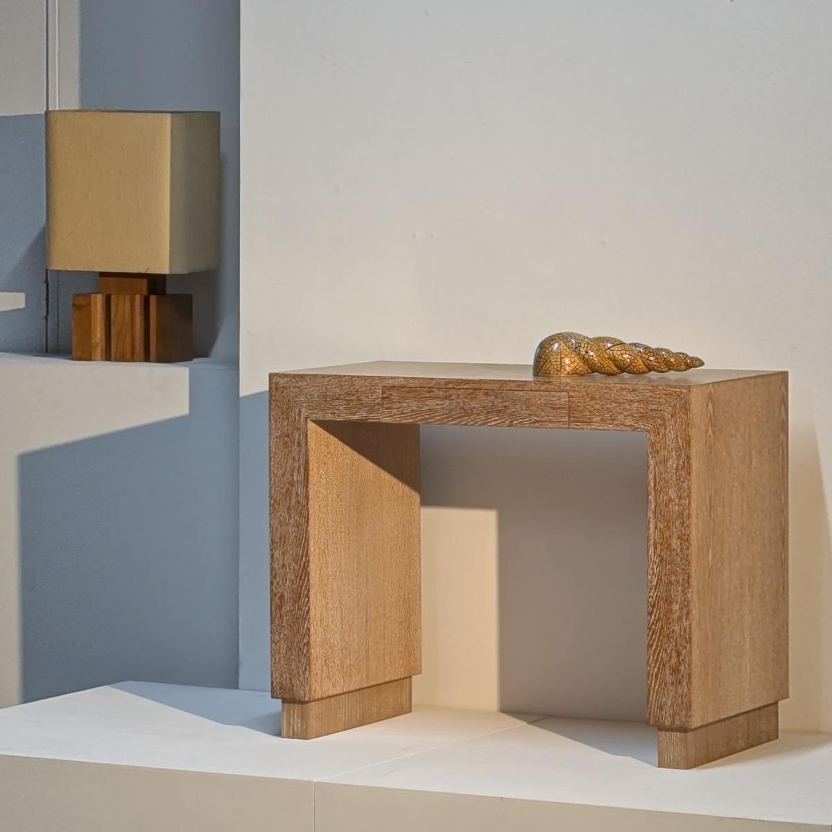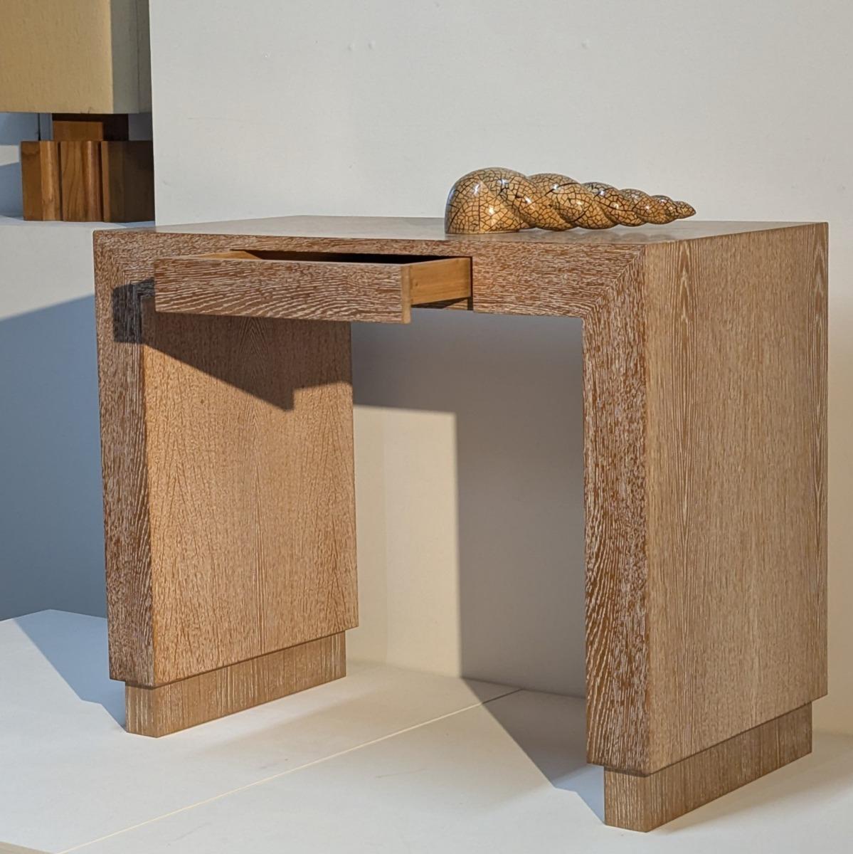 Elégante petite console ou bureau, en chêne plaqué cérusé dans l'esprit des années 40, travail datant des années 80. 1 tiroir en façade. Travail d'ébénisterie de qualité, en trés bon état.