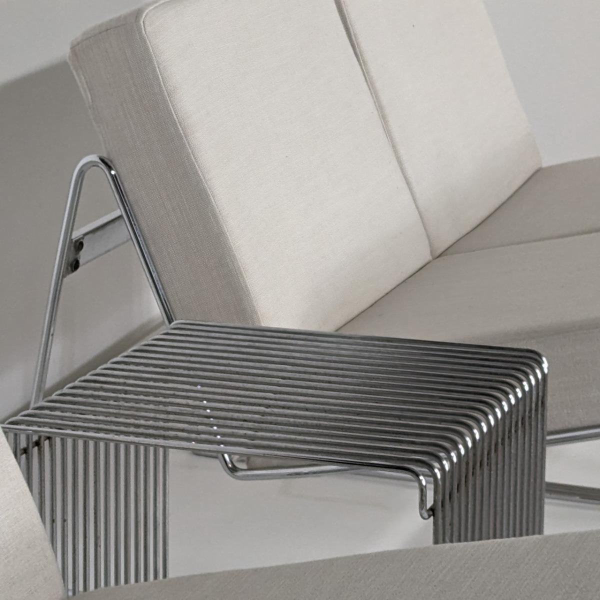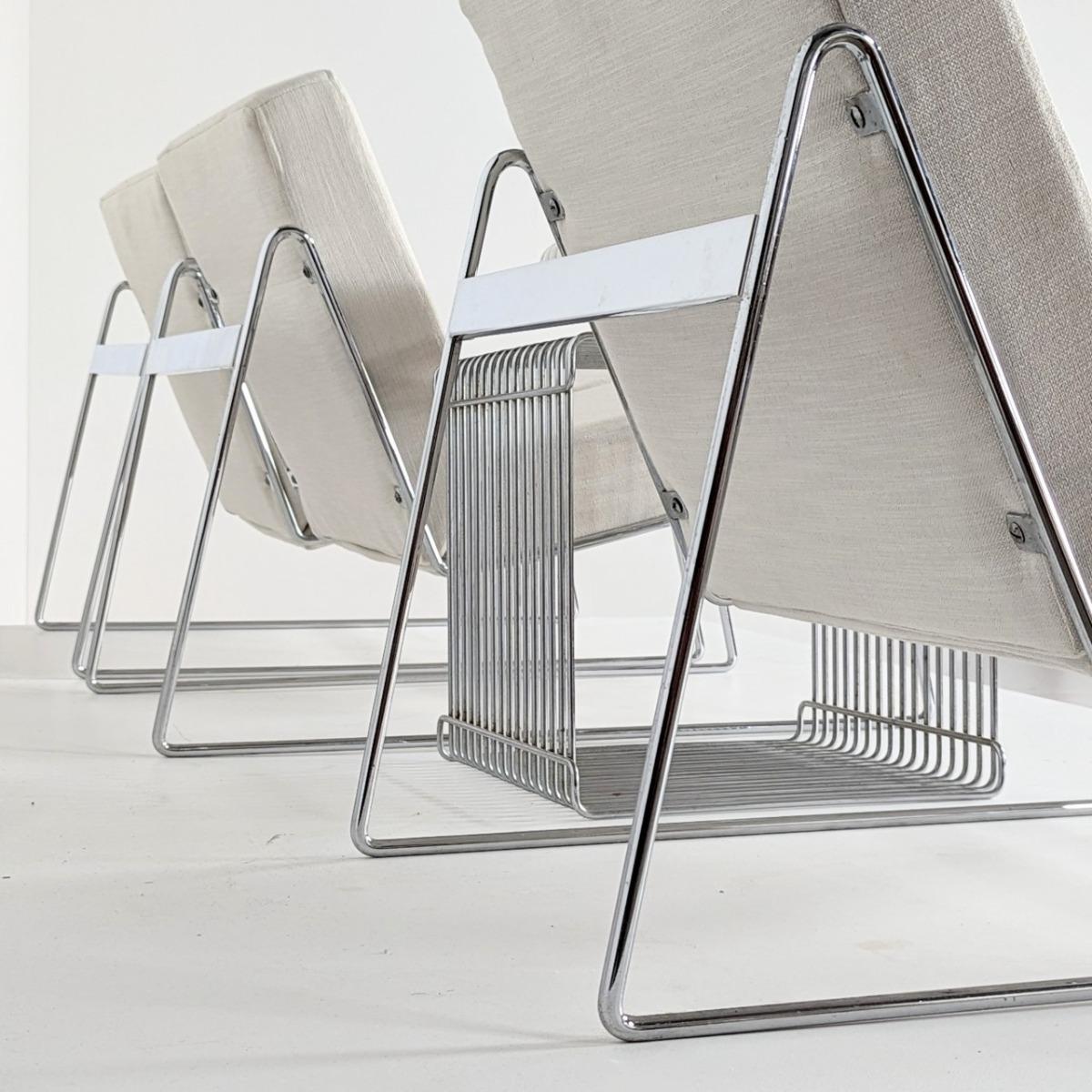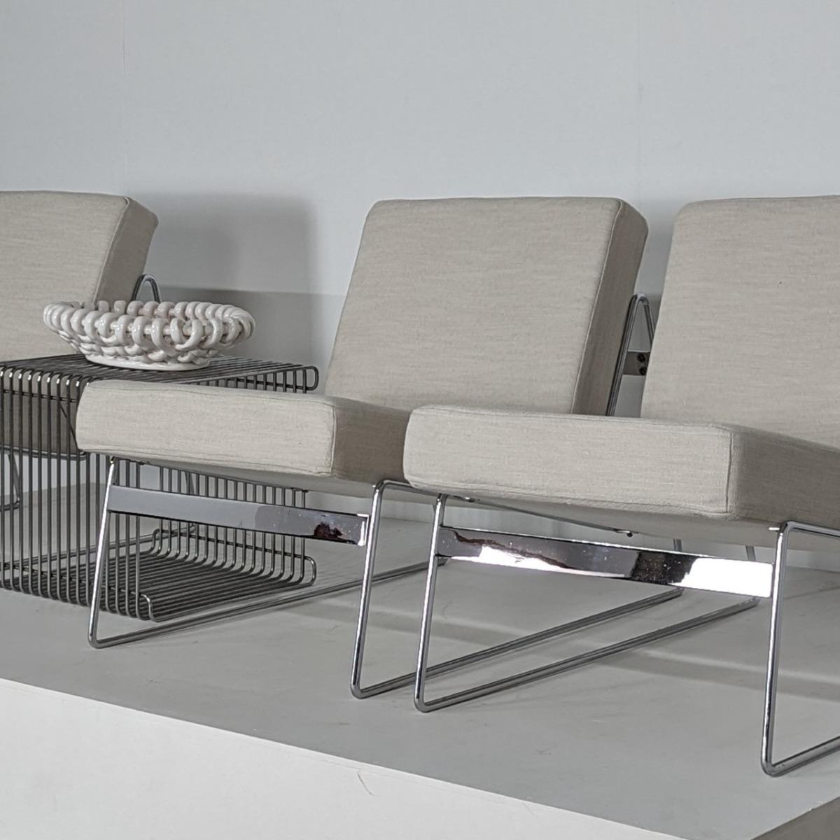 Chauffeuses des années 70, en fil de fer chromé. Coussins refaits à neuf. Quelques traces d'oxydation. Hauteur assise 34cm Hauteur dossier 63cm A vendre en paire ou l'ensemble de 3 formant presque un canapé.