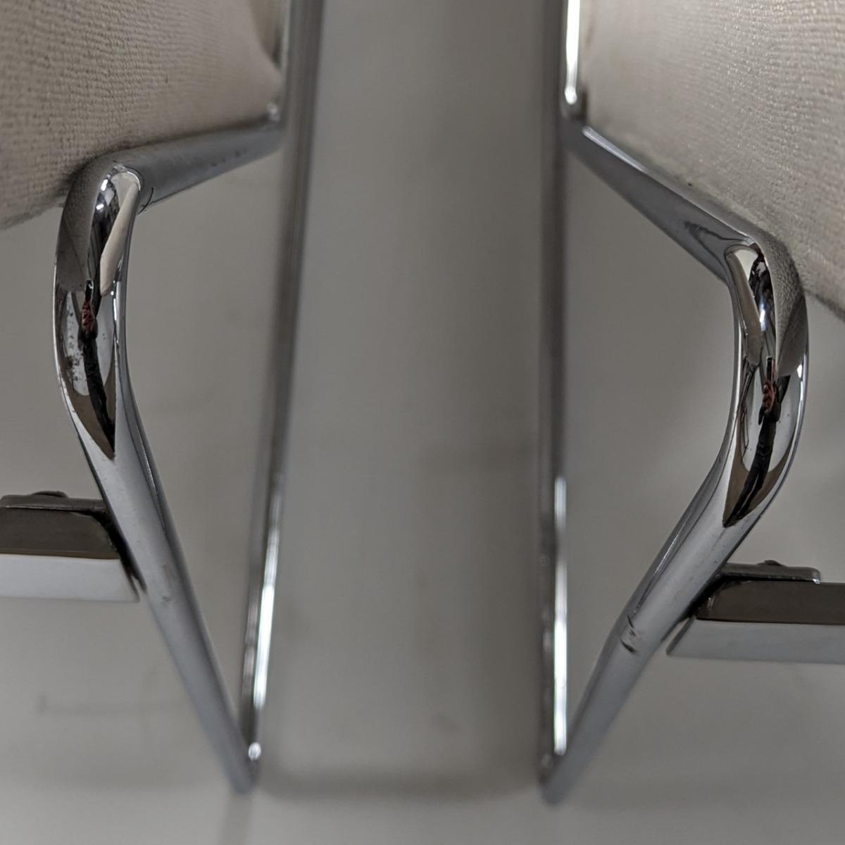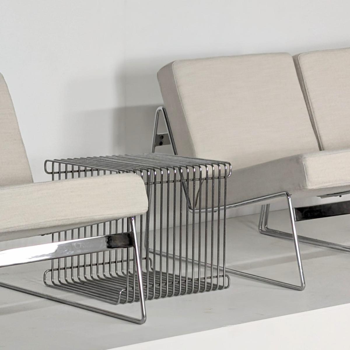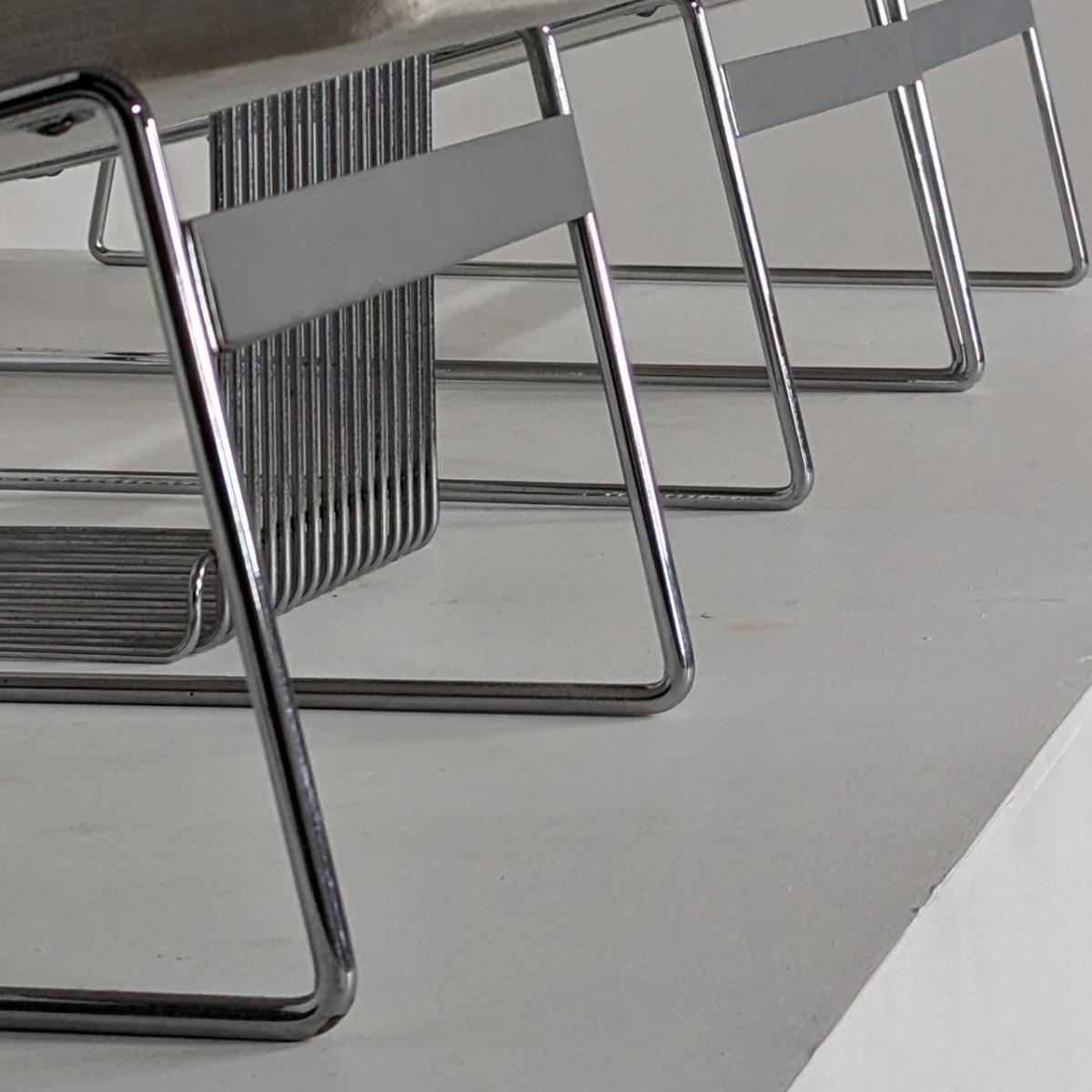 Chauffeuses des années 70, en fil de fer chromé. Coussins refaits à neuf. Quelques traces d'oxydation. Hauteur assise 34cm Hauteur dossier 63cm A vendre en paire ou l'ensemble de 3 formant presque un canapé.