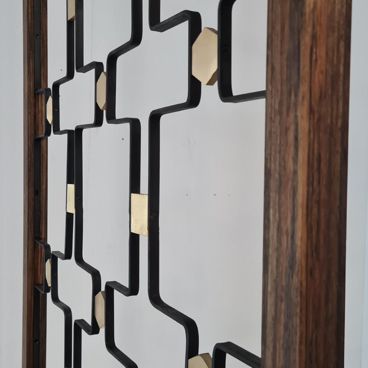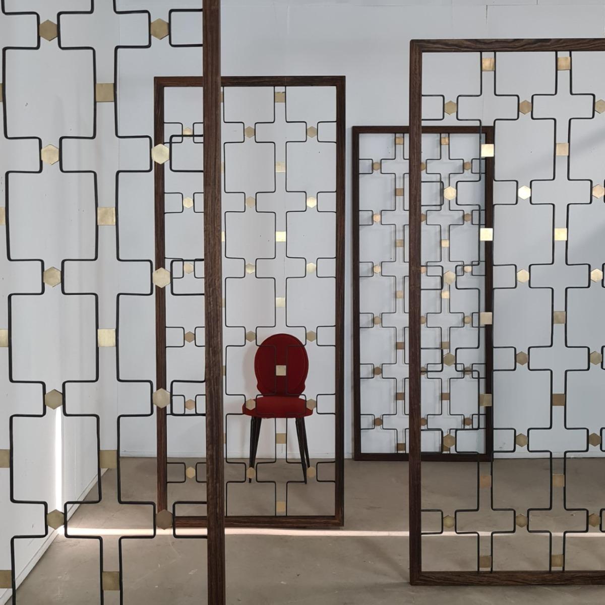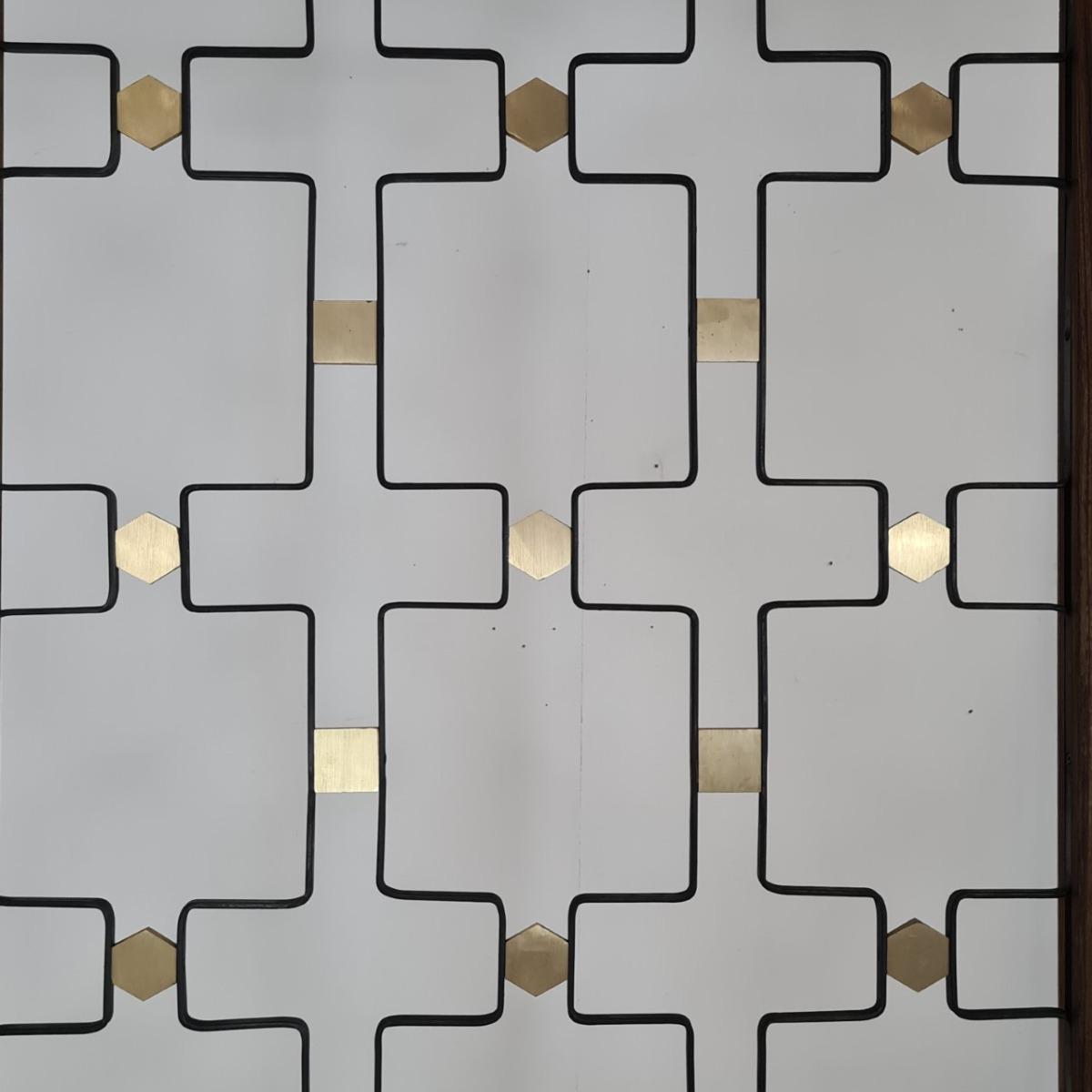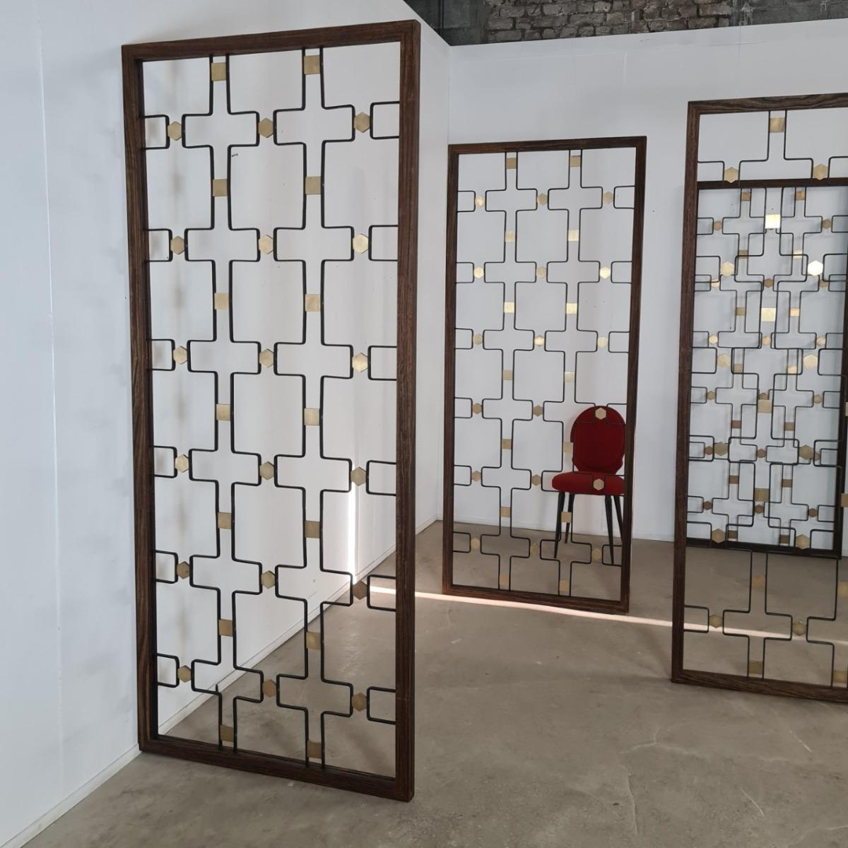 Claustras années 60, décor de pastilles en laiton. Commande d'un ensemblier décorateur dans les années 60 pour sa maison et son magasin, dans le goût de Jean Royère. Encadrements neufs , en bois, réalisés par notre ébéniste. 6 disponibles