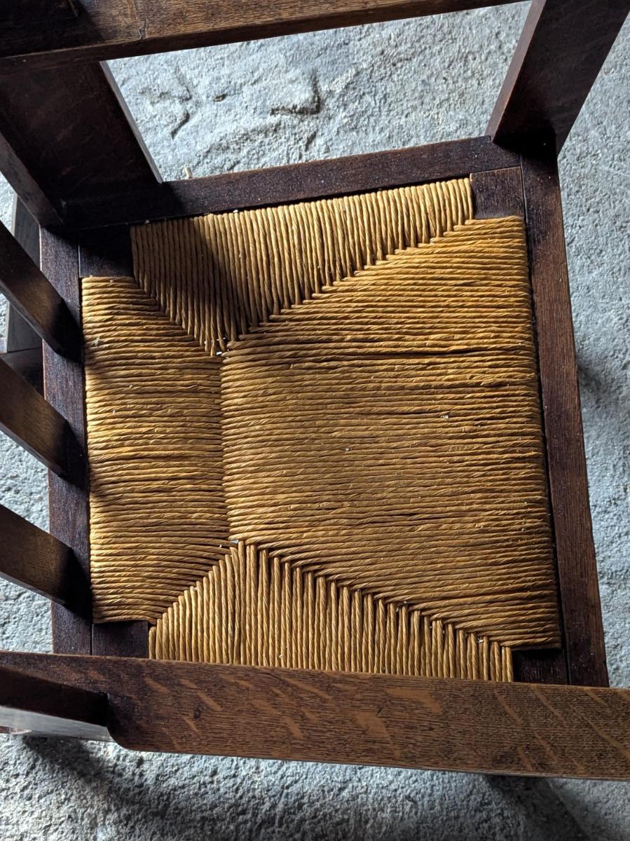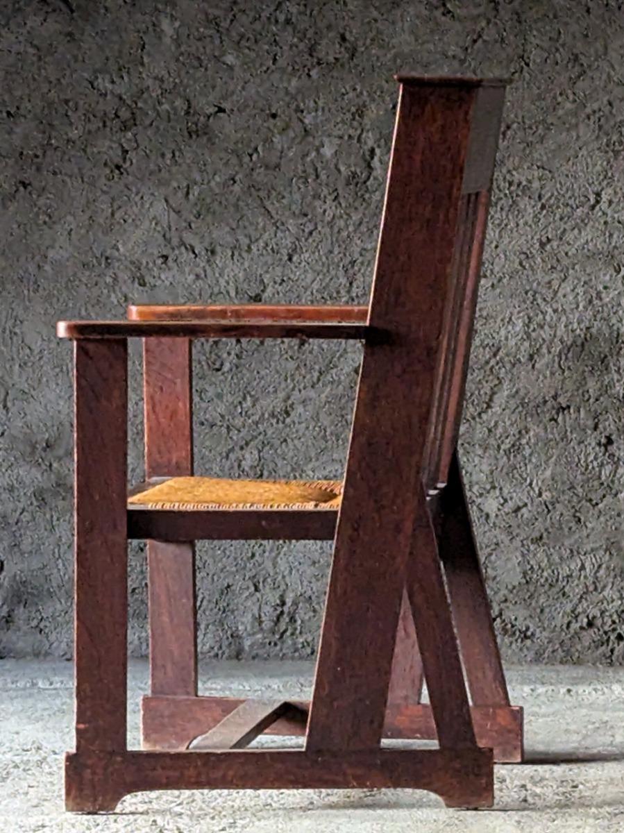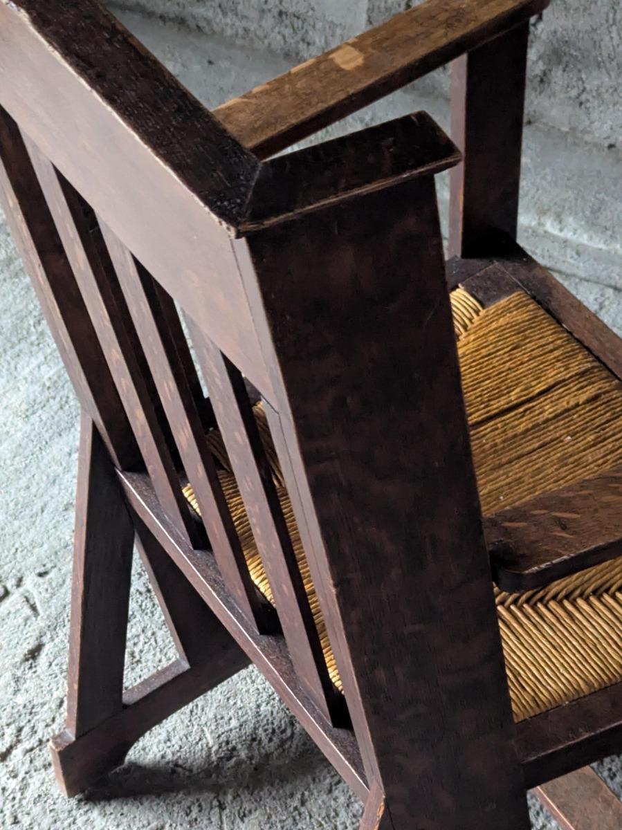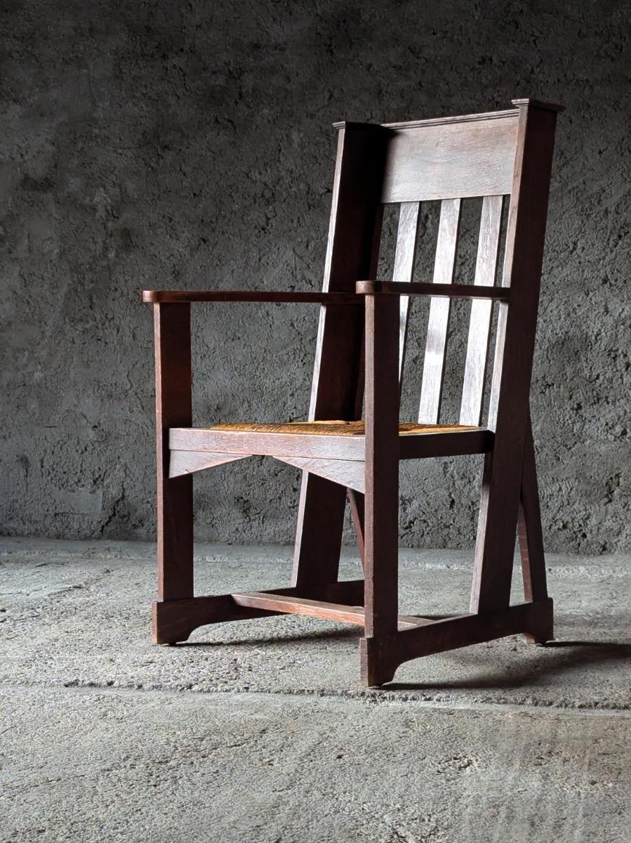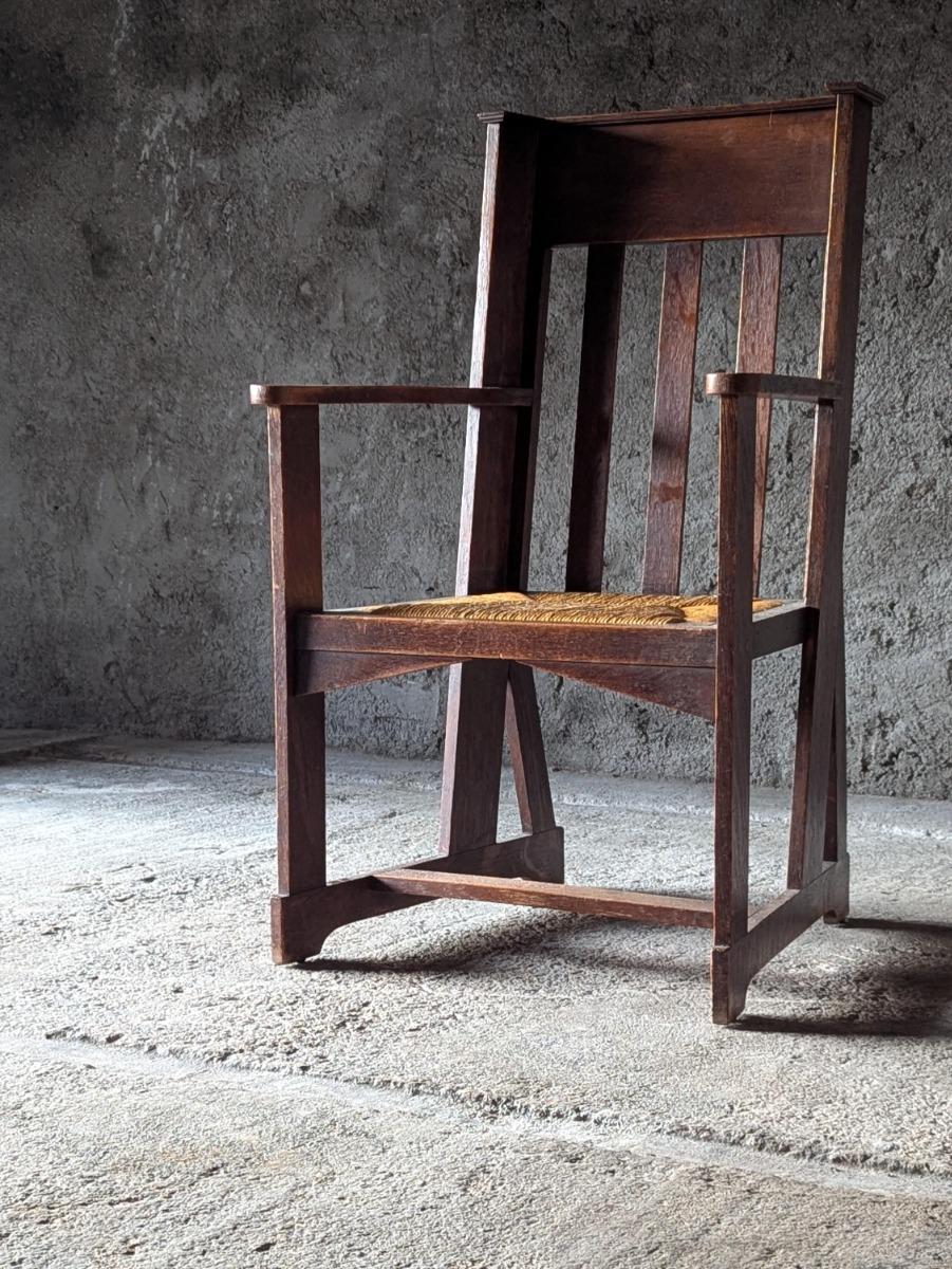 Superbe fauteuil en chêne, vers 1900, modèle très proche de ceux de la firme anglaise Liberty and co. Assise en paille, en trés bon état.