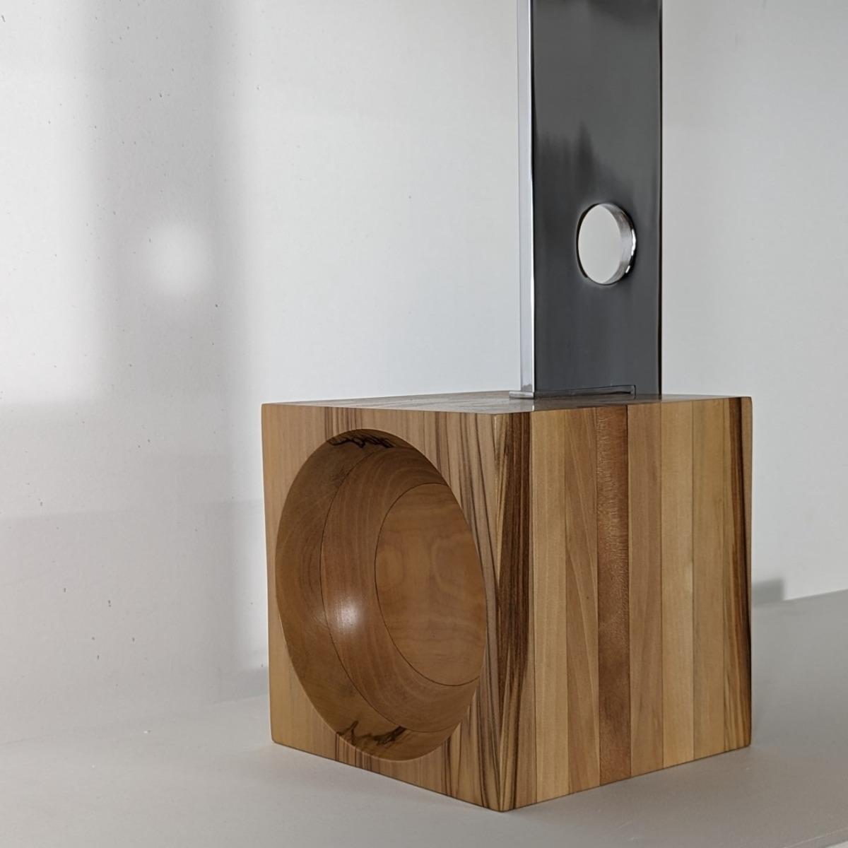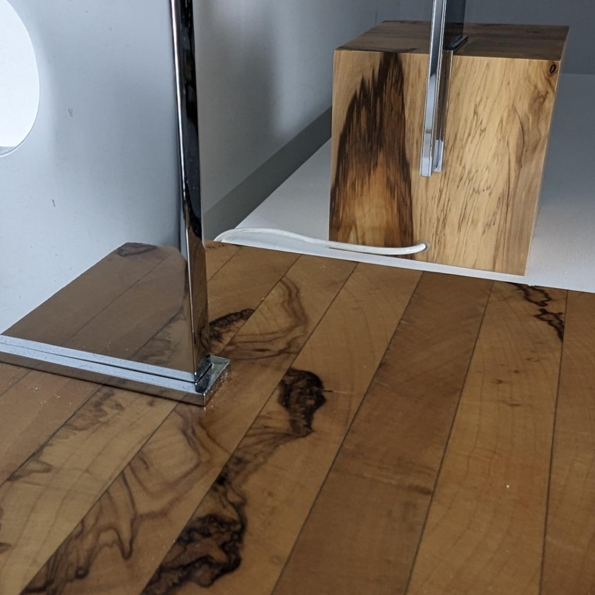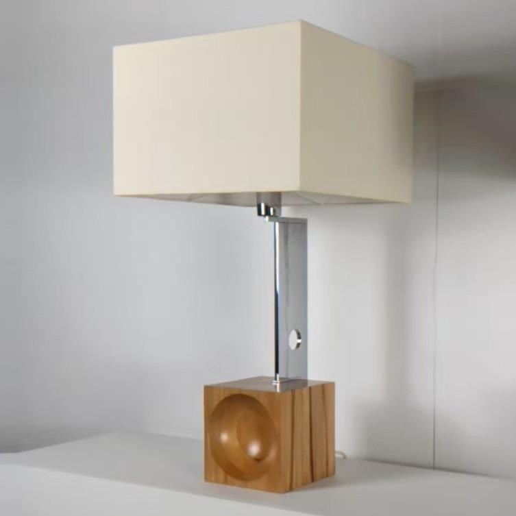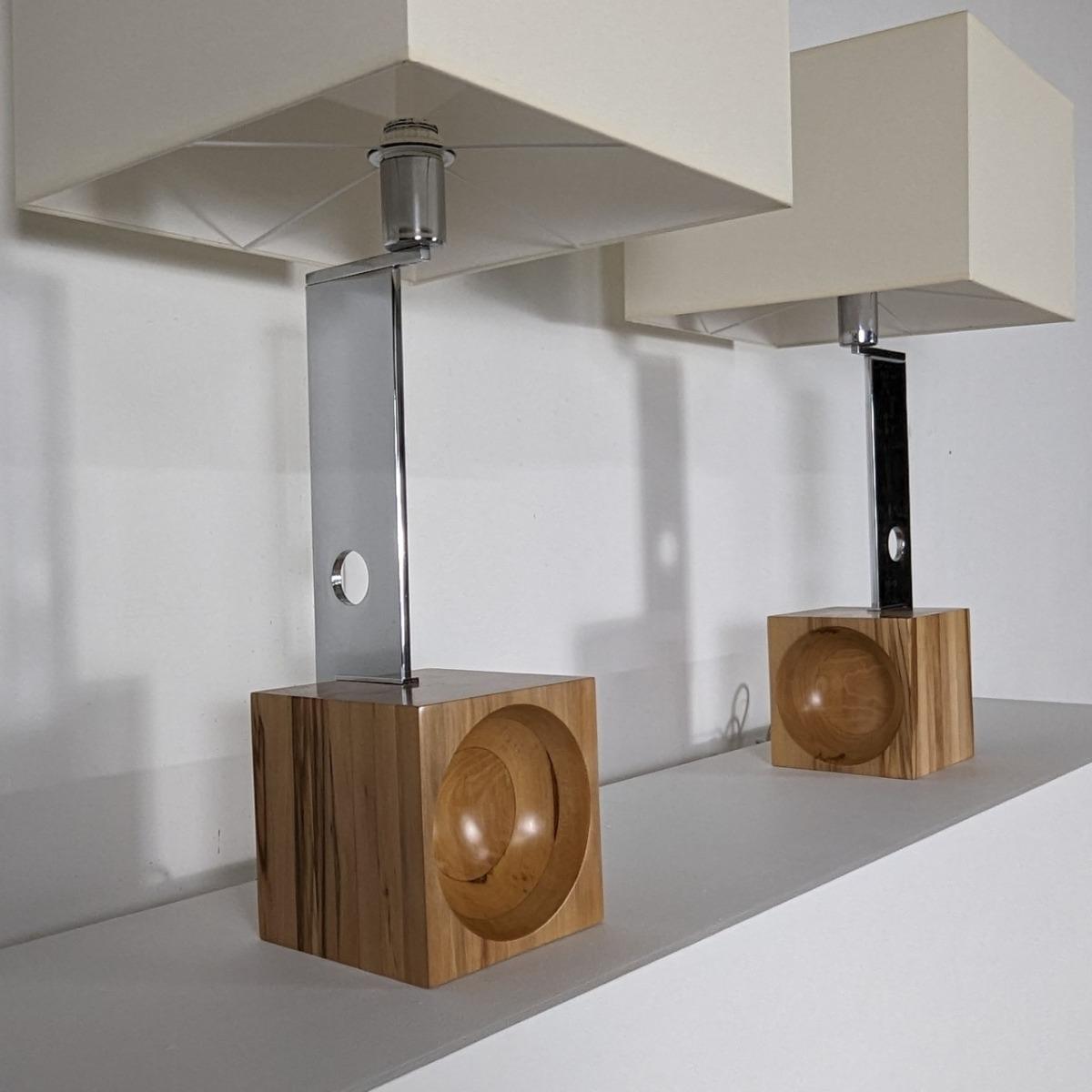 Paire de lampes années 70 de la maison Esperia, design attribué à Angelo Brotto. Italie. En parfait état, base en noyer, montant en aluminium chromé, abat-jours neufs.