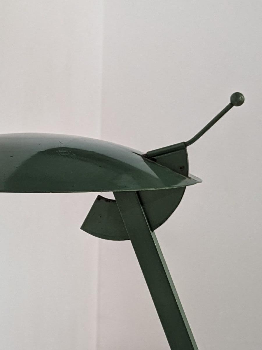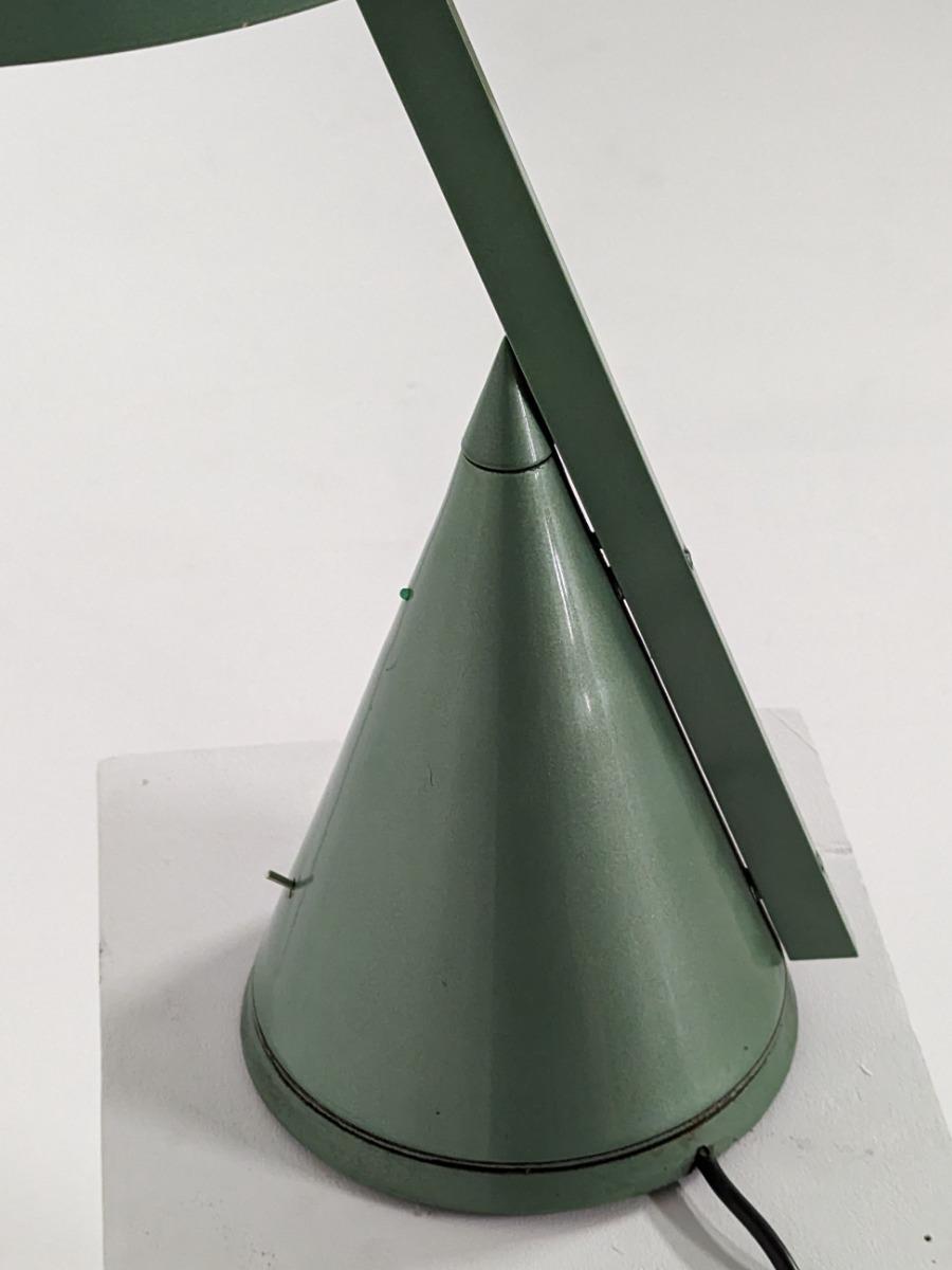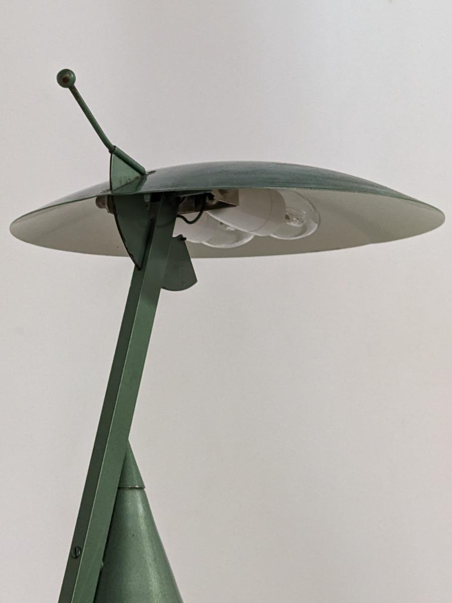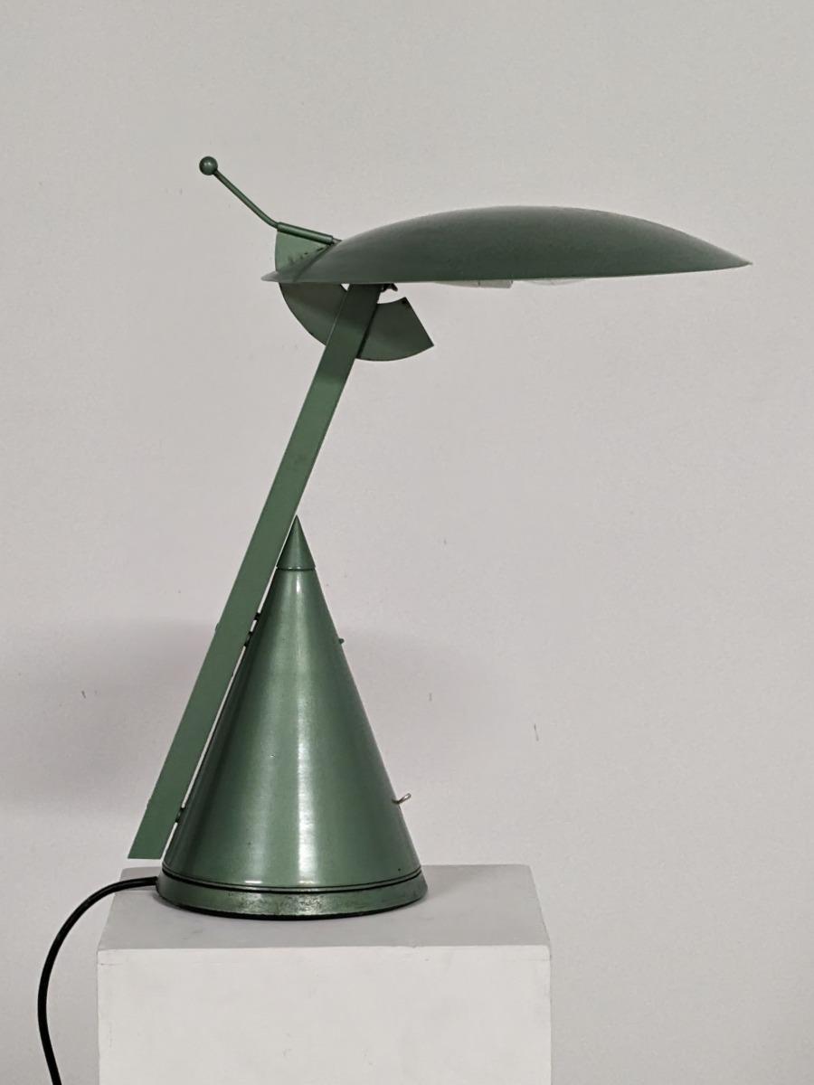 Rare lampe, modèle "Moebius", design Marc Berthier, 1984. Couleur vert métallisé, base tournante, interrupteur à 2 positions d'intensité (2 ampoules).