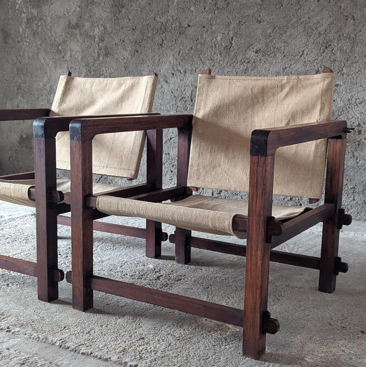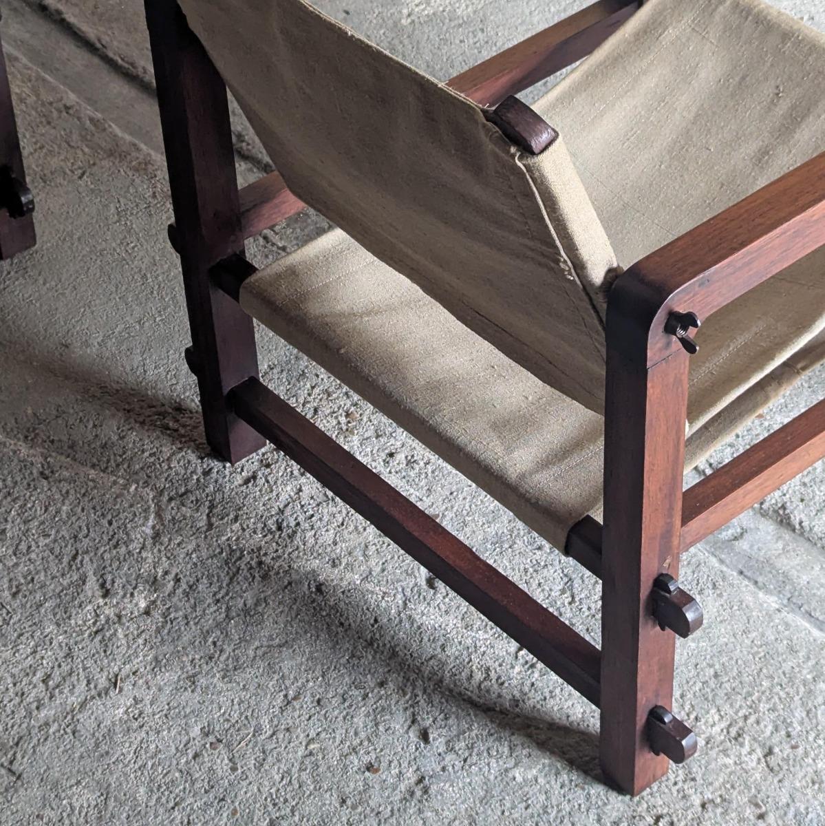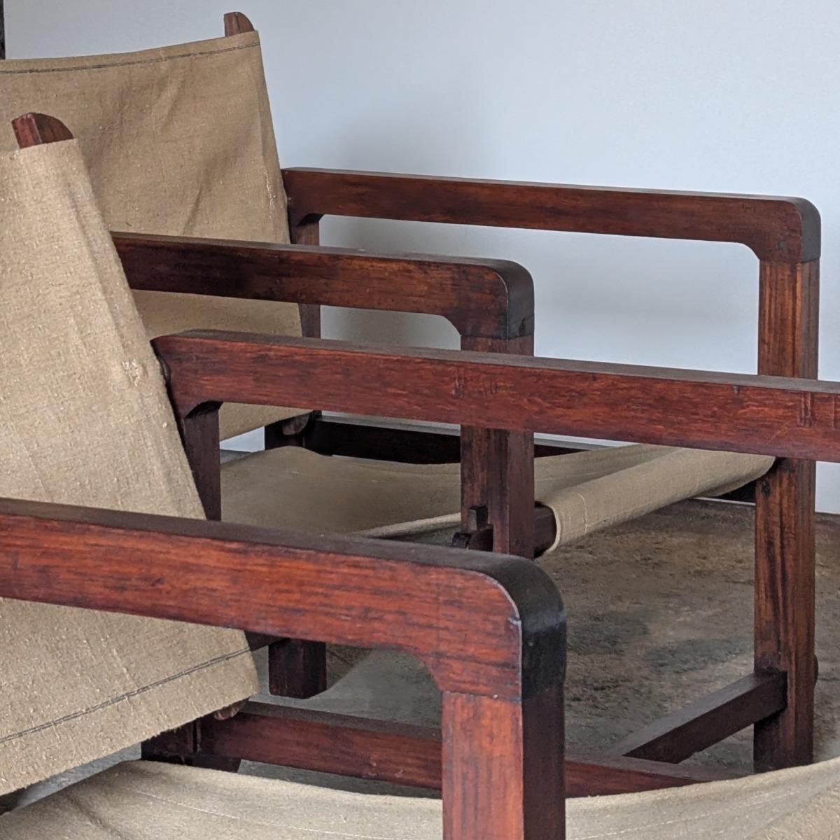 Paire de fauteuils dits Safari, fabrication française années 30. Trés stable et confortable, toile d'origine. Dossier inclinable. En trés bon état, quelques traces normales d'usage. Hauteur assise 35cm Hauteur dossier 73cm largeur 70cm Profondeur 62cm