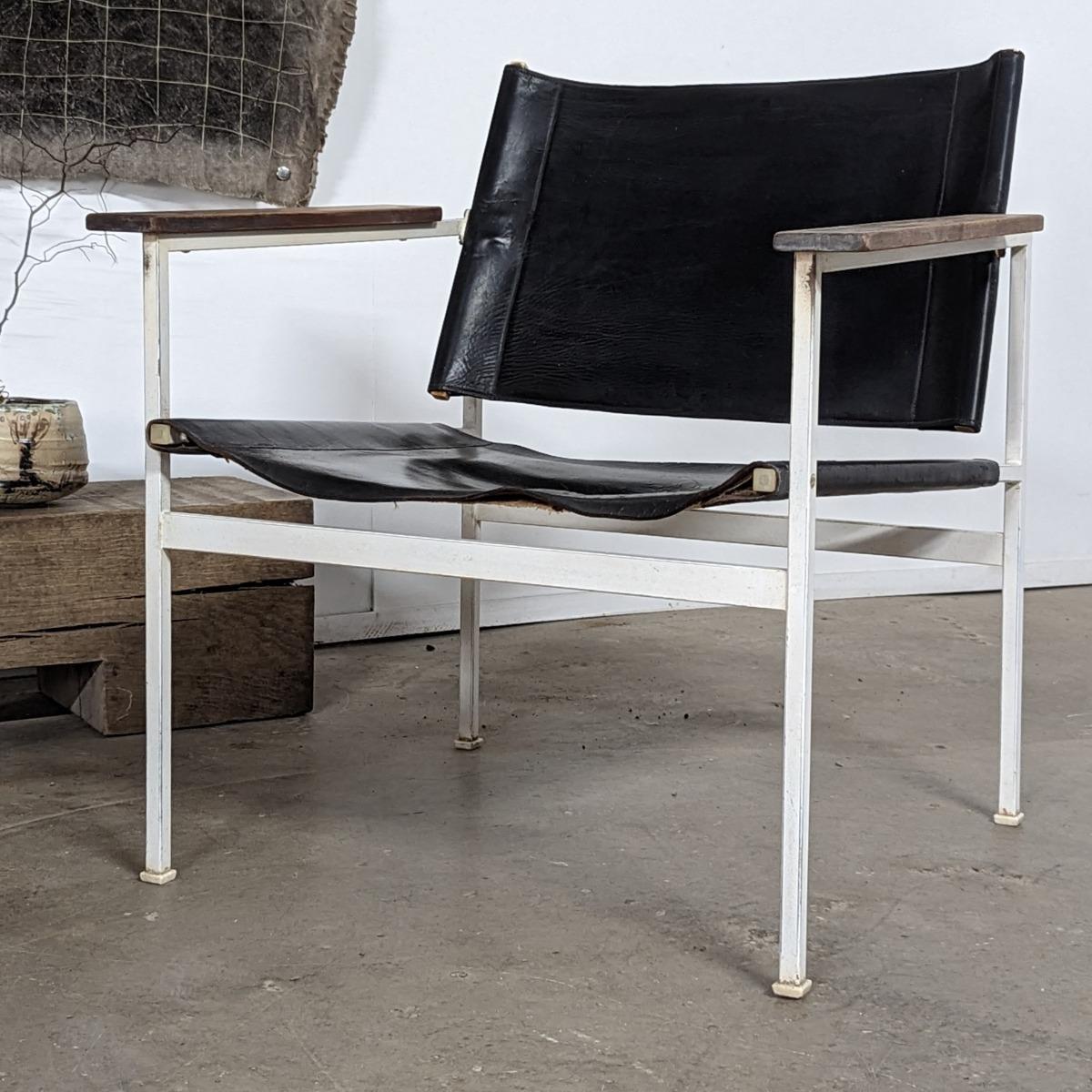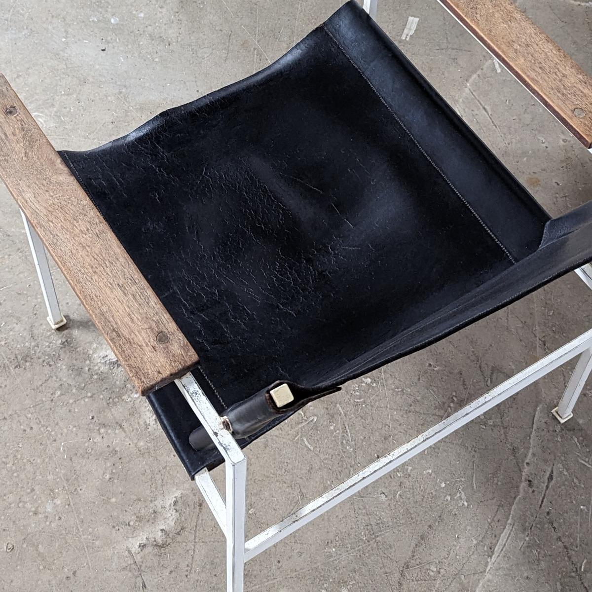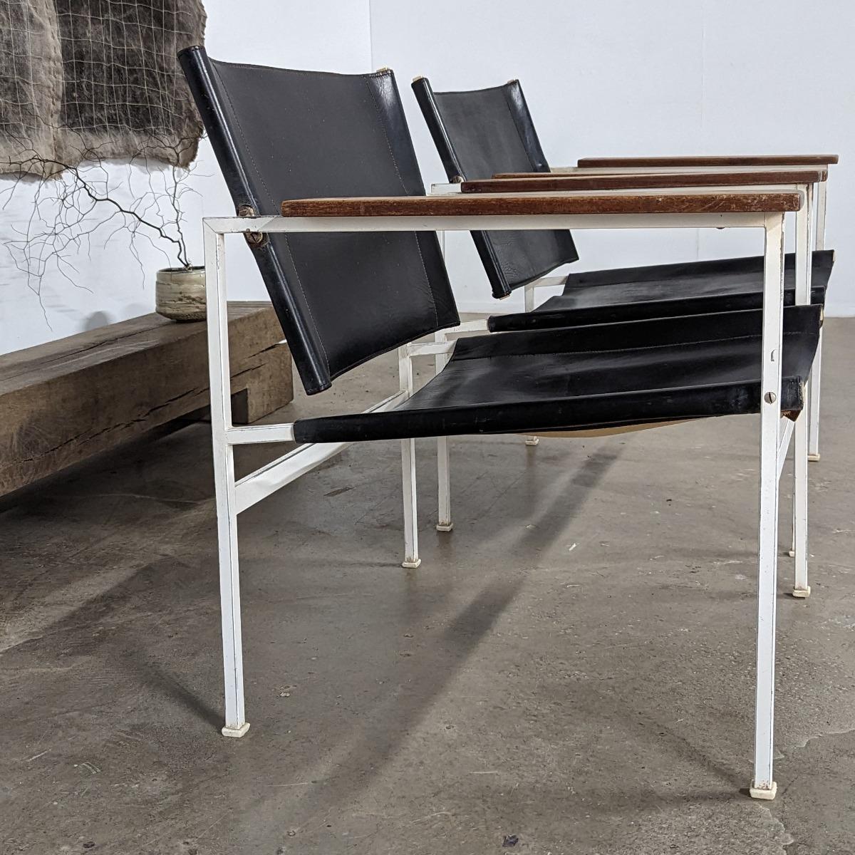Jolie paire de fauteuils années 60. Cuir et métal laqué en blanc. Très bon état, d origine. Sans restauration. Patine usée. Haut d assise 34cm