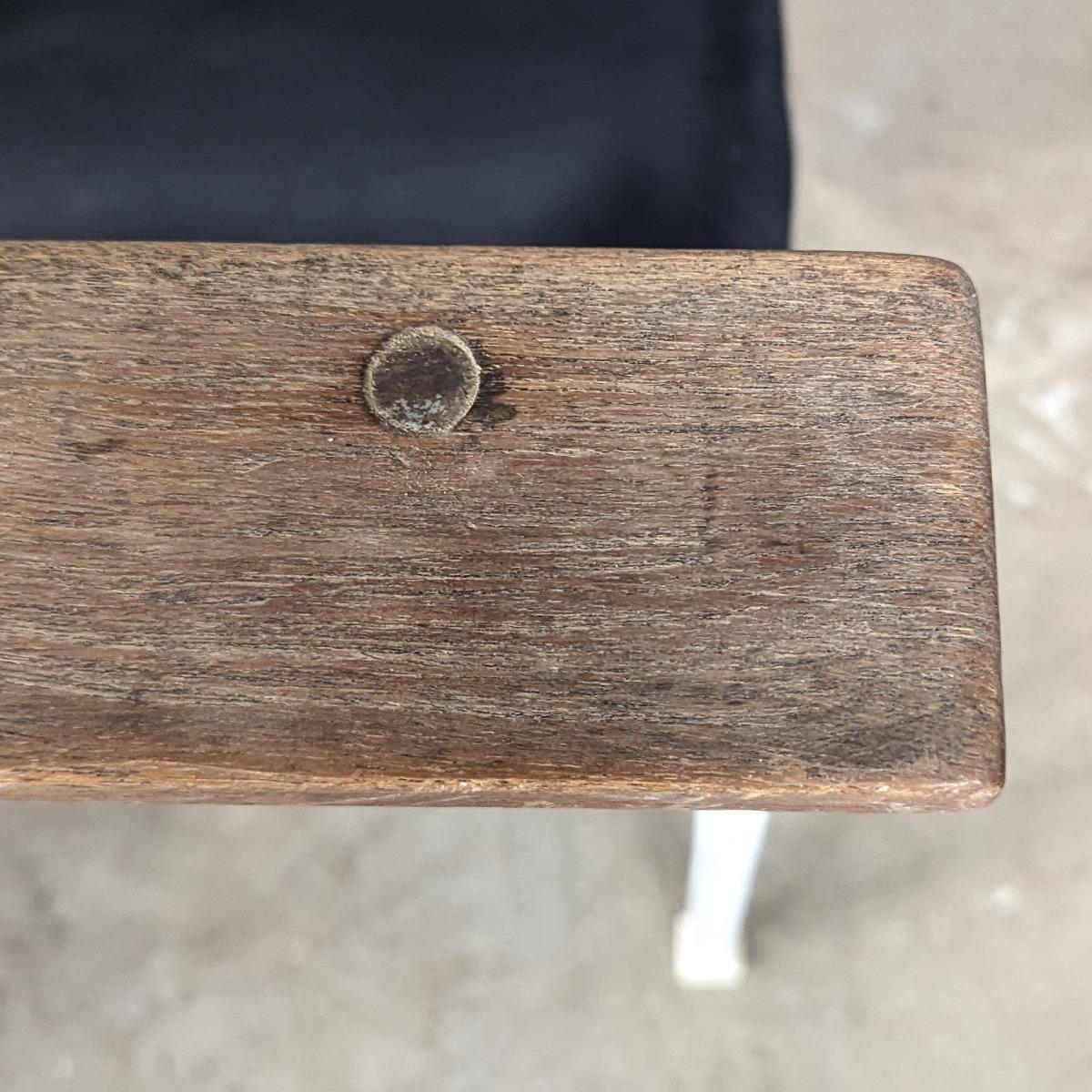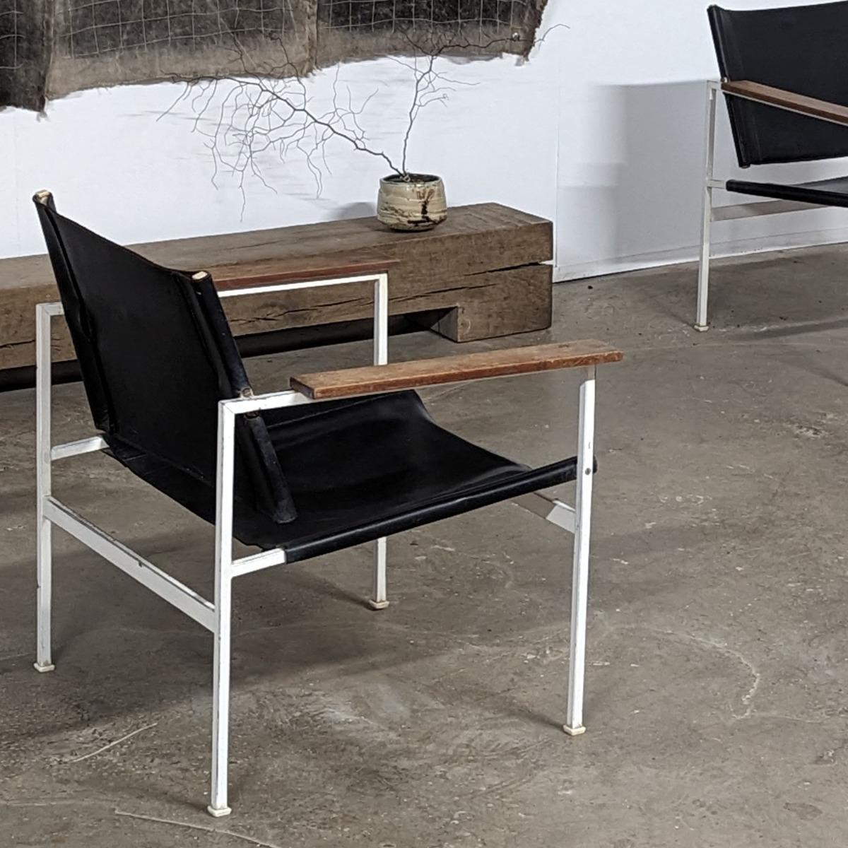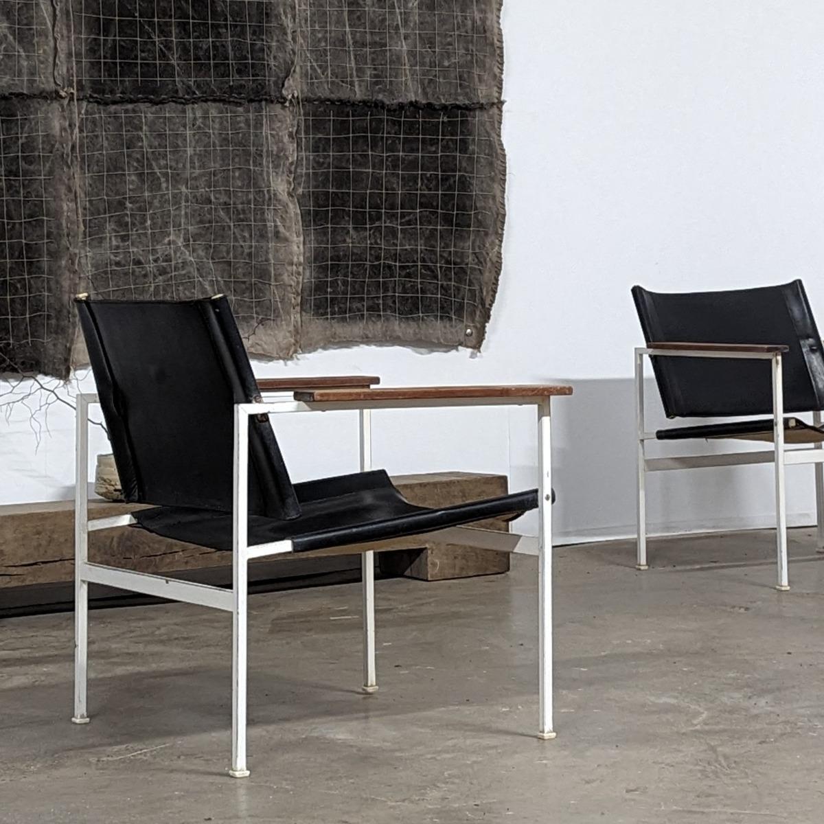 Jolie paire de fauteuils années 60. Cuir et métal laqué en blanc. Très bon état, d origine. Sans restauration. Patine usée. Haut d assise 34cm