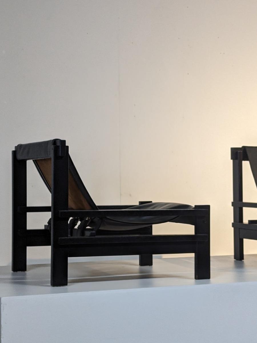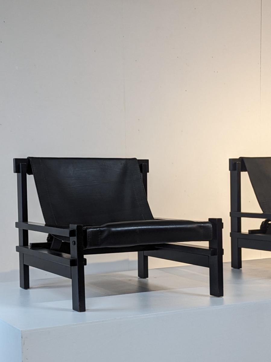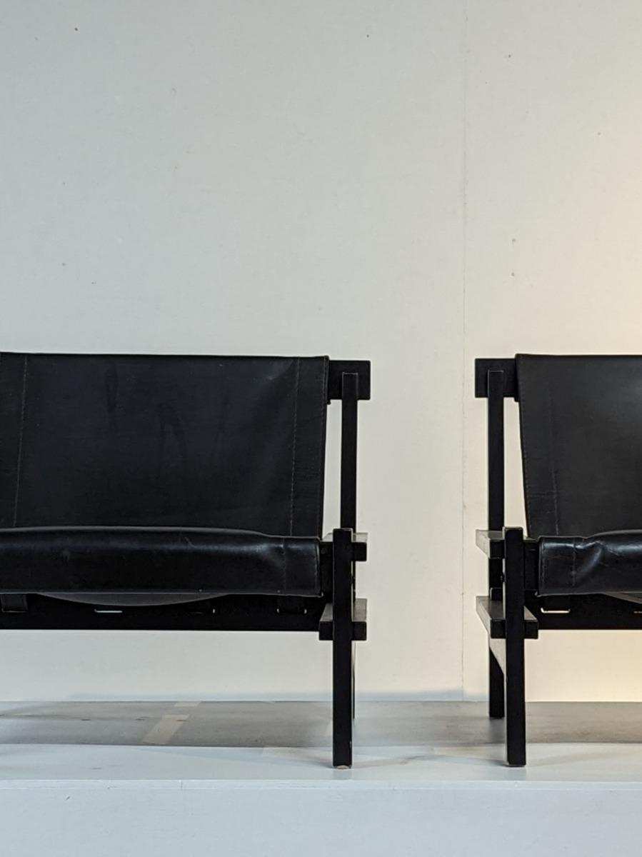 Paire de fauteuils au design constructiviste, attribuée à Soja Wasseur, designeuse hollandaise. Années 70/80, en trés bon état d'origine.
