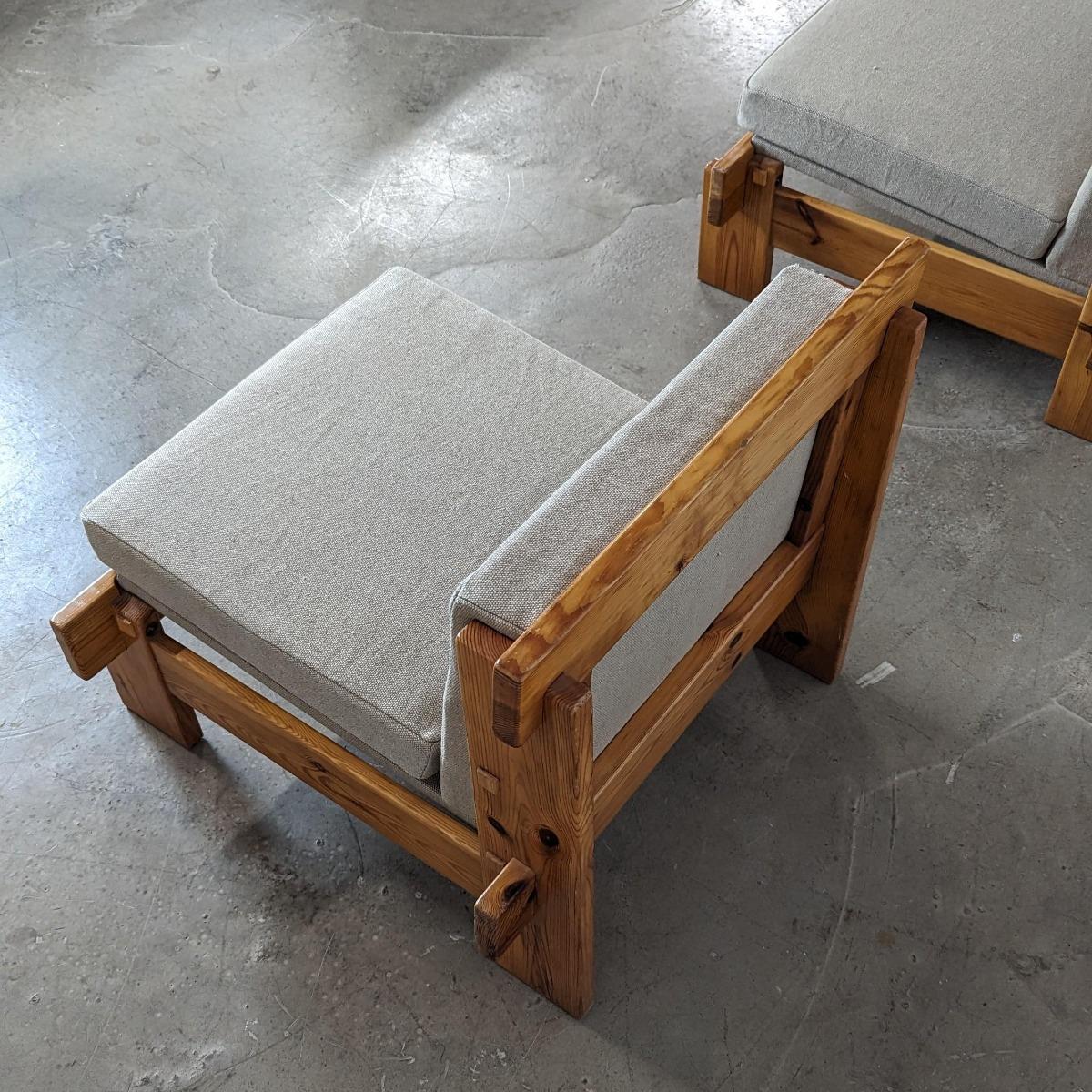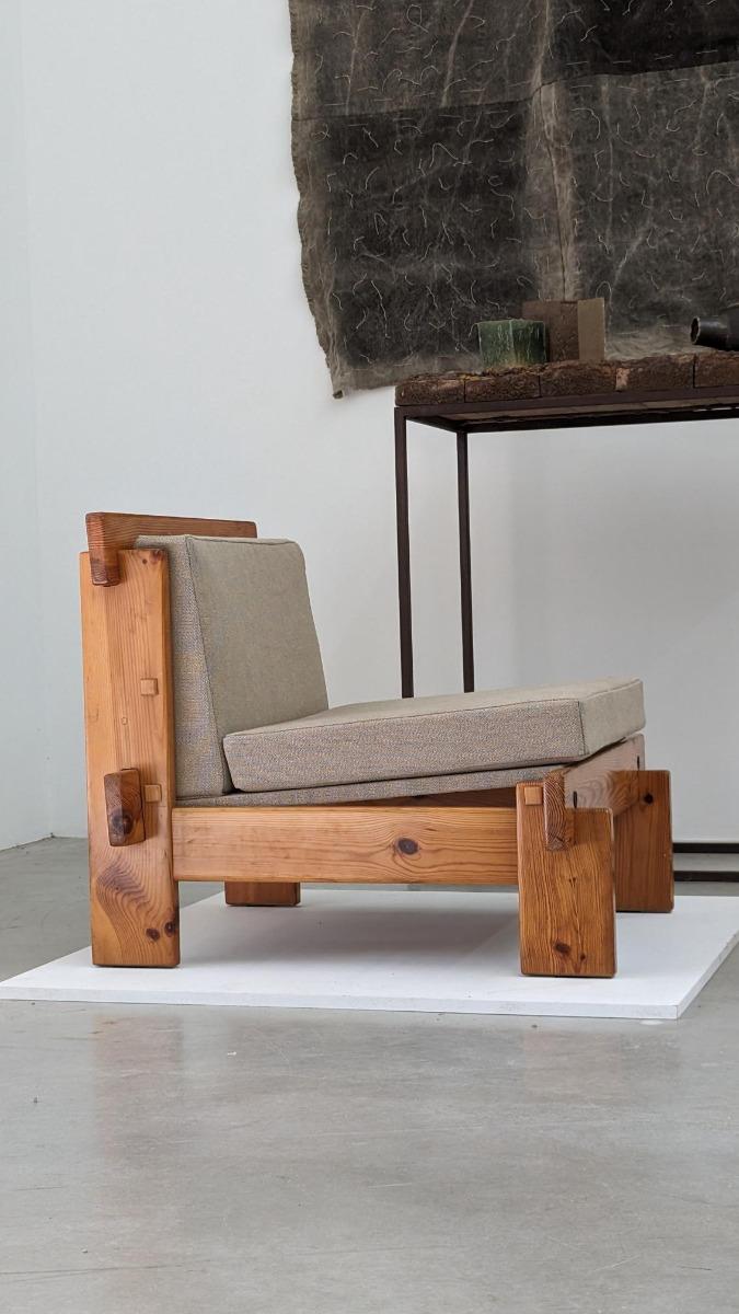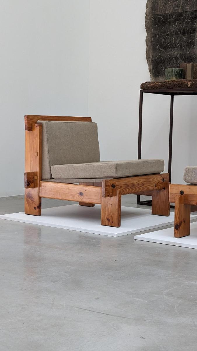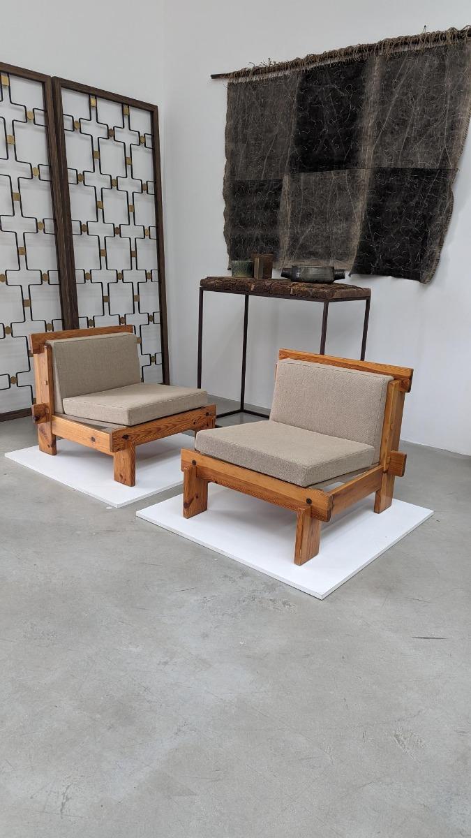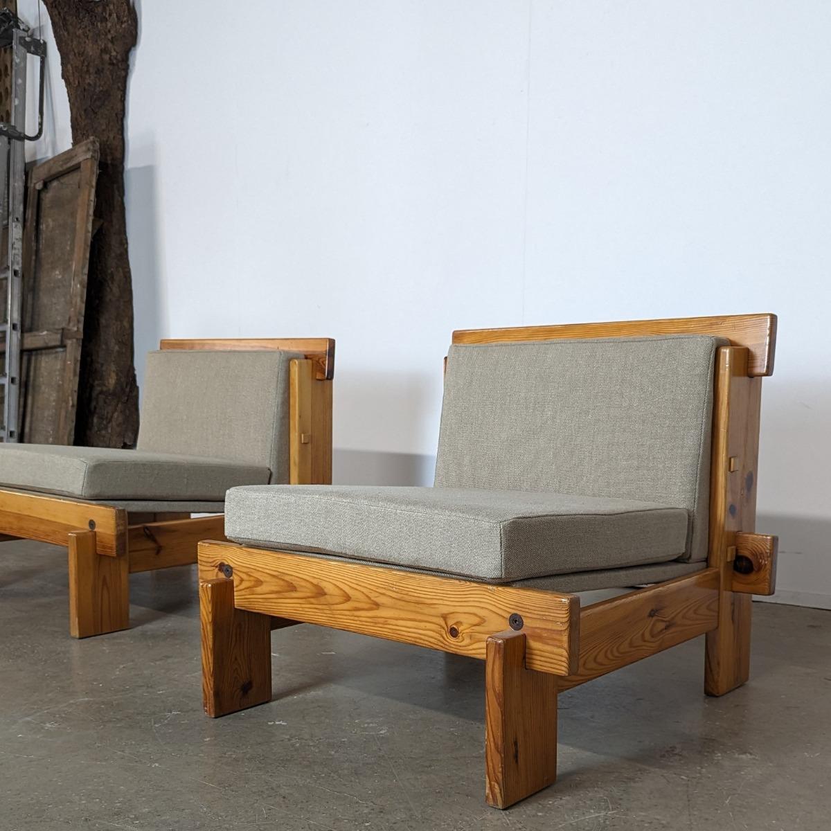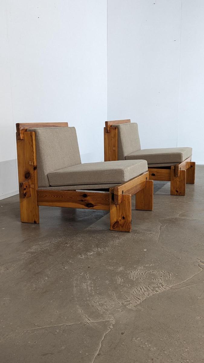 Paire de fauteuils en sapin, années 70, dans un style chalet, au design moderniste et minimaliste. Coussins refaits à neuf. Haut dossier 69cm Haut assise 41cm largeur 78cm profondeur 79cm