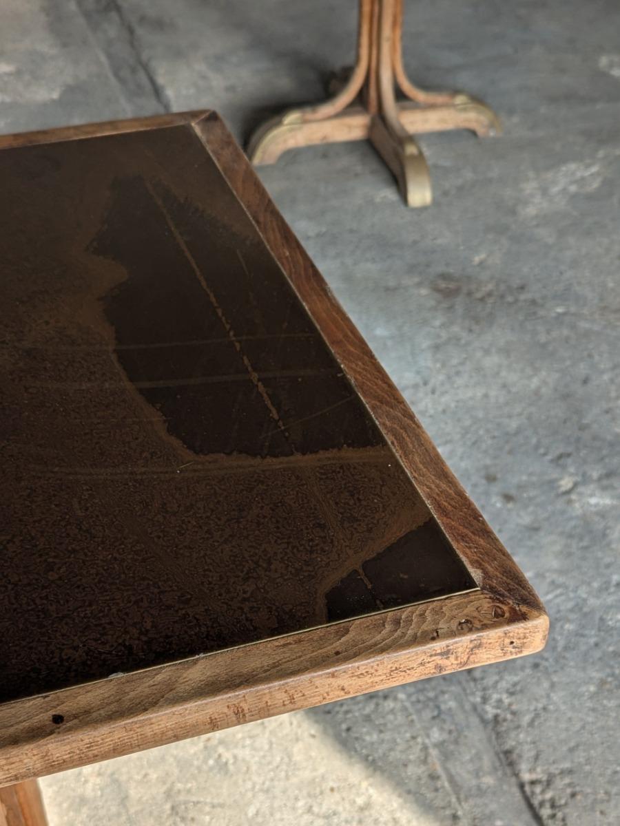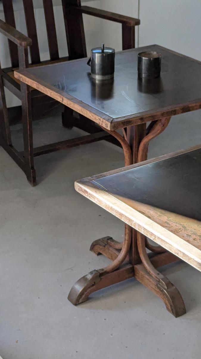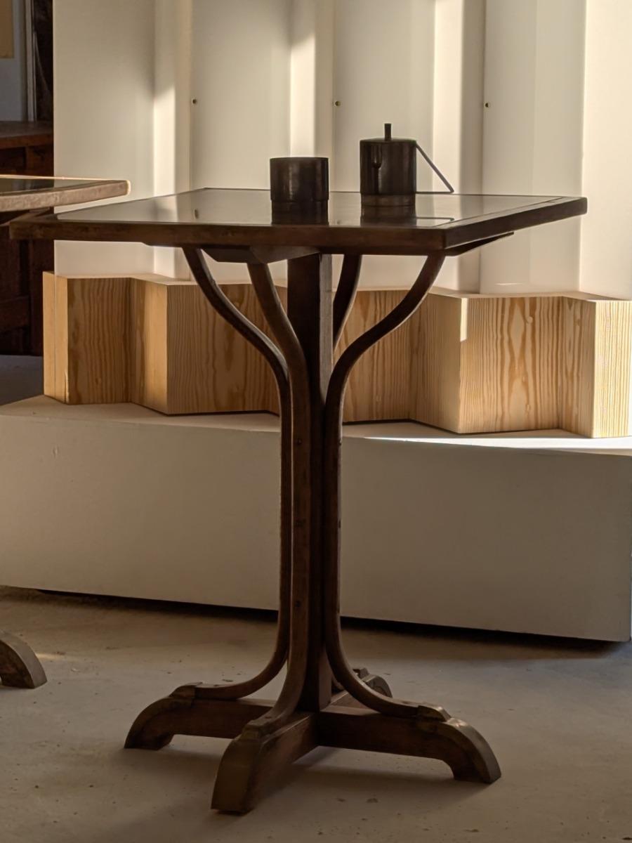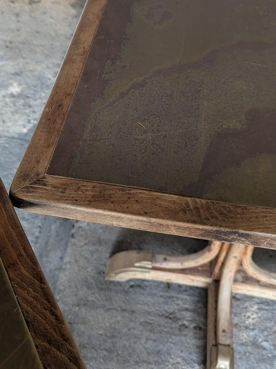 paire de tables bistrot piètement en bois courbé, plateau en laiton et piètements rehaussés de laiton. vers 1920. Thonet/Fischel...