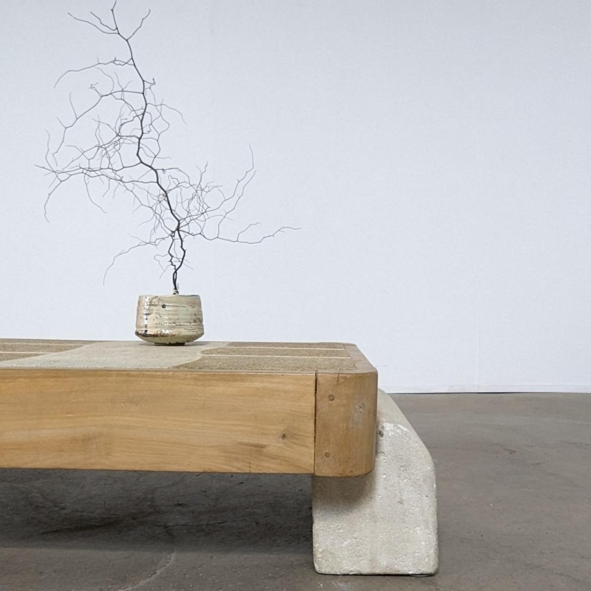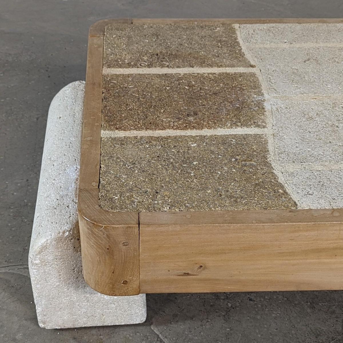 Iinhabituelle table basse plateau en pierre de Bourgogne et cadre en orme. Plateau posé sur 2 pieds en pierre taillée. Trés décoratif et belle taille.