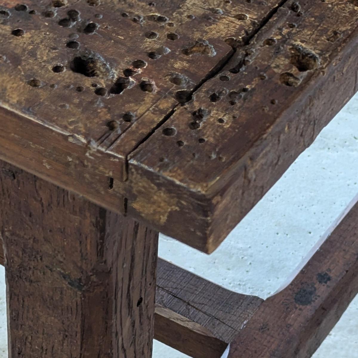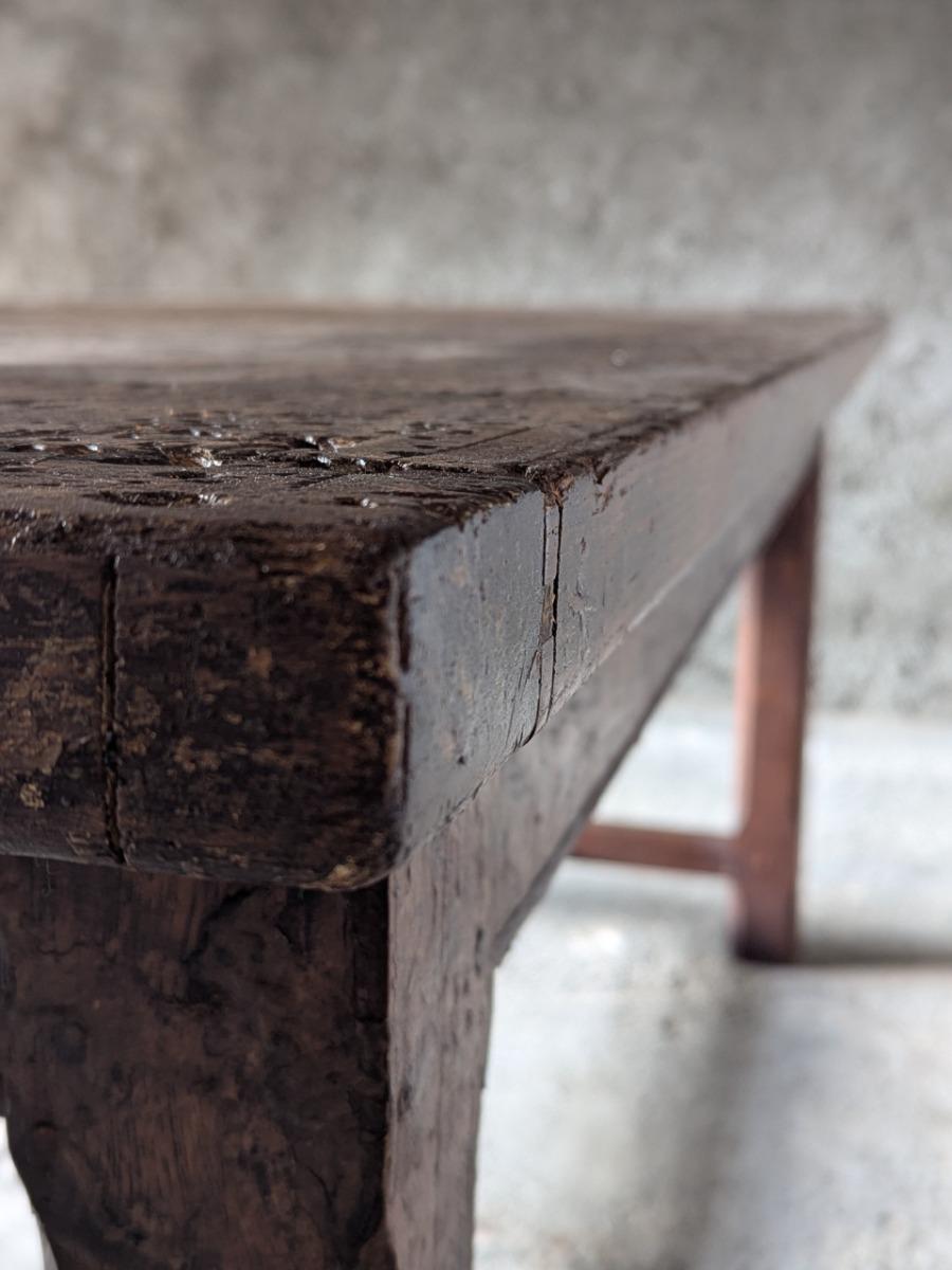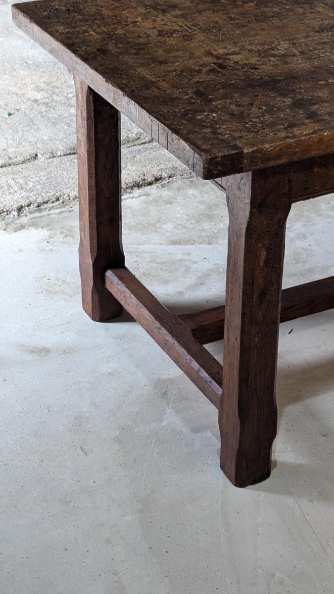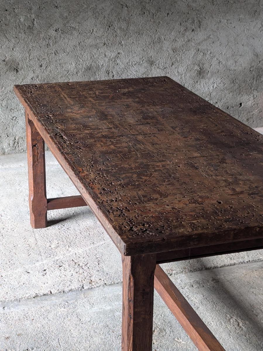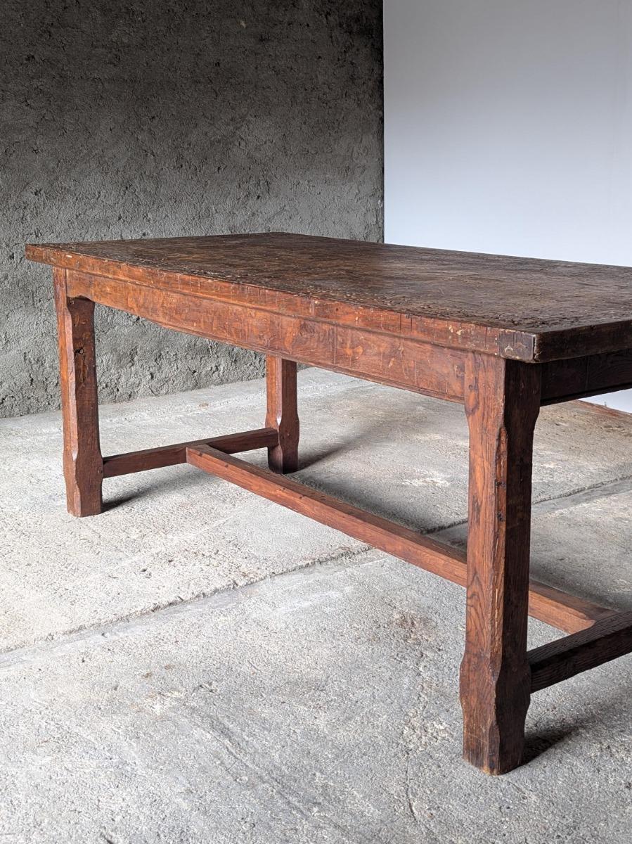 table provenant d'un atelier de menuiserie, superbe patine du plateau. Piètement en chêne massif et plateau en chêne plaqué.