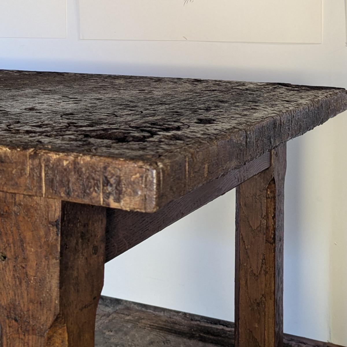 Originale table d'atelier, trés belle usure du plateau. Esprit wabi-sabi. Piètement en chêne massif, plateau en chêne plaqué.