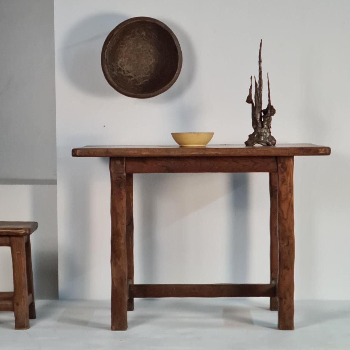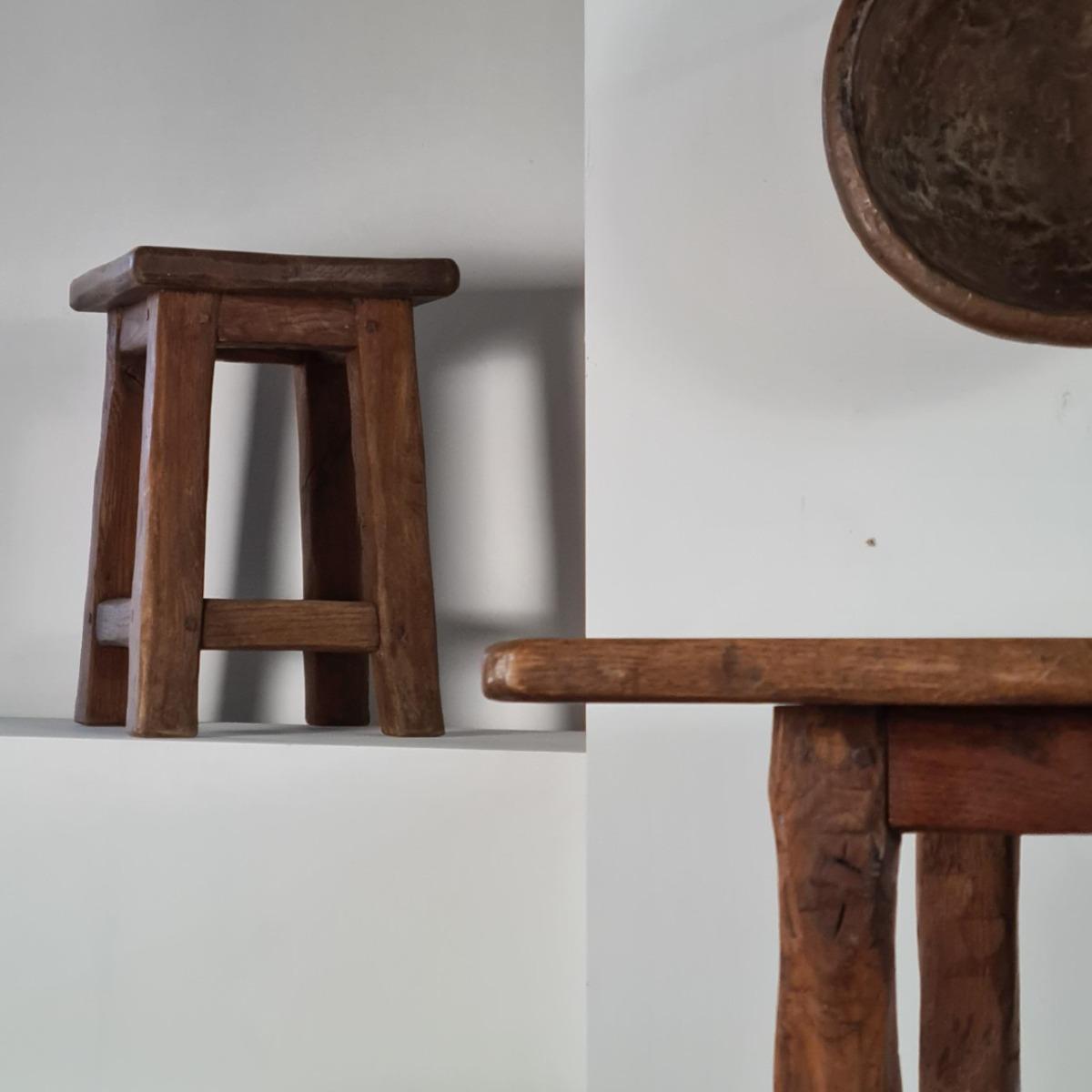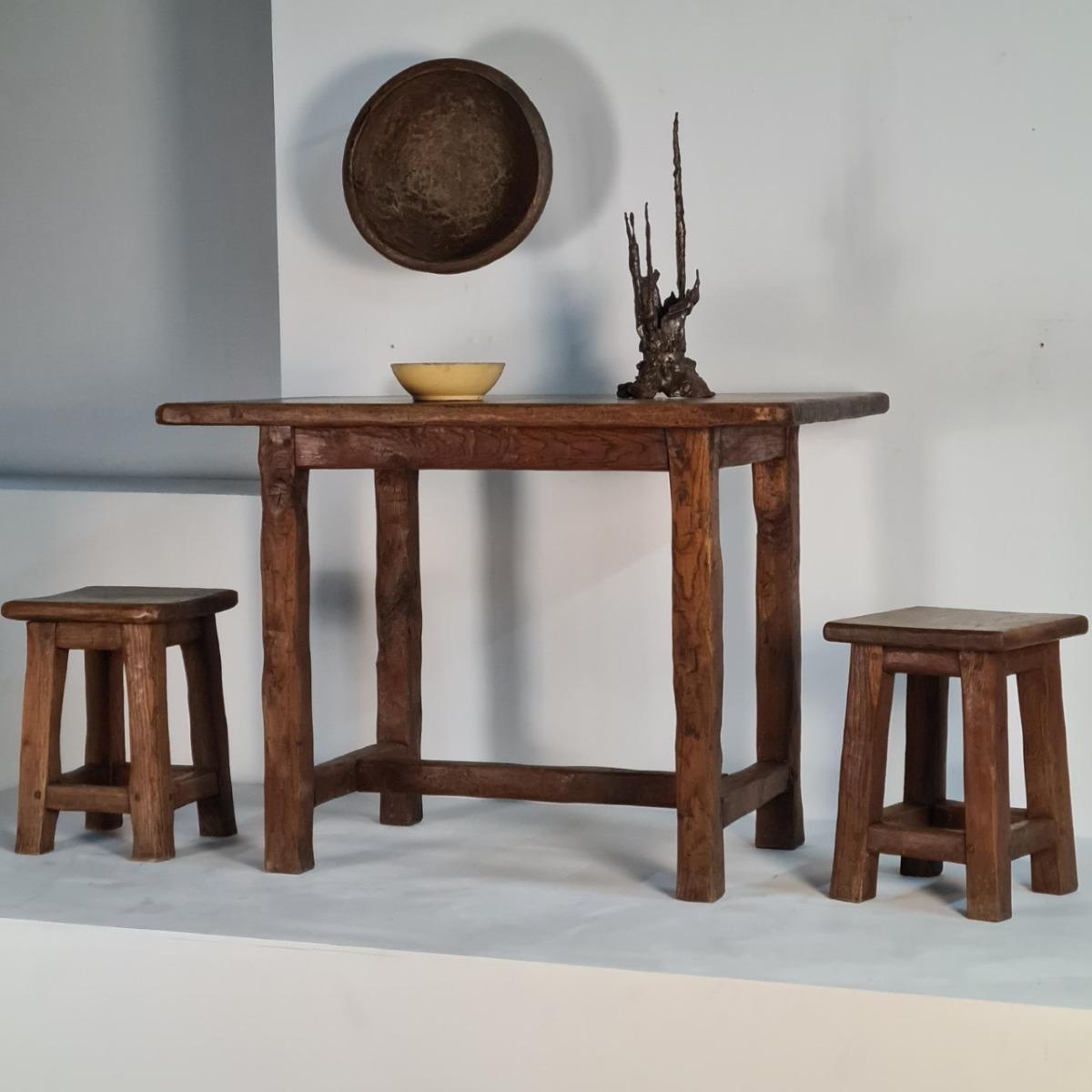 Ensemble 4 tabourets et 1 table en chêne, style brutaliste. Travail artisanal, art populaire français.1960s