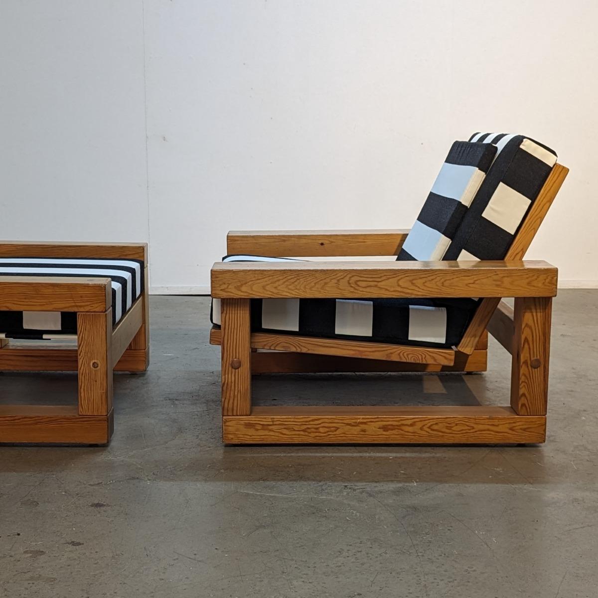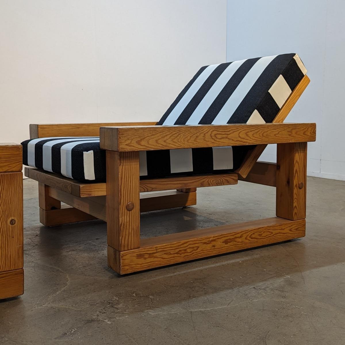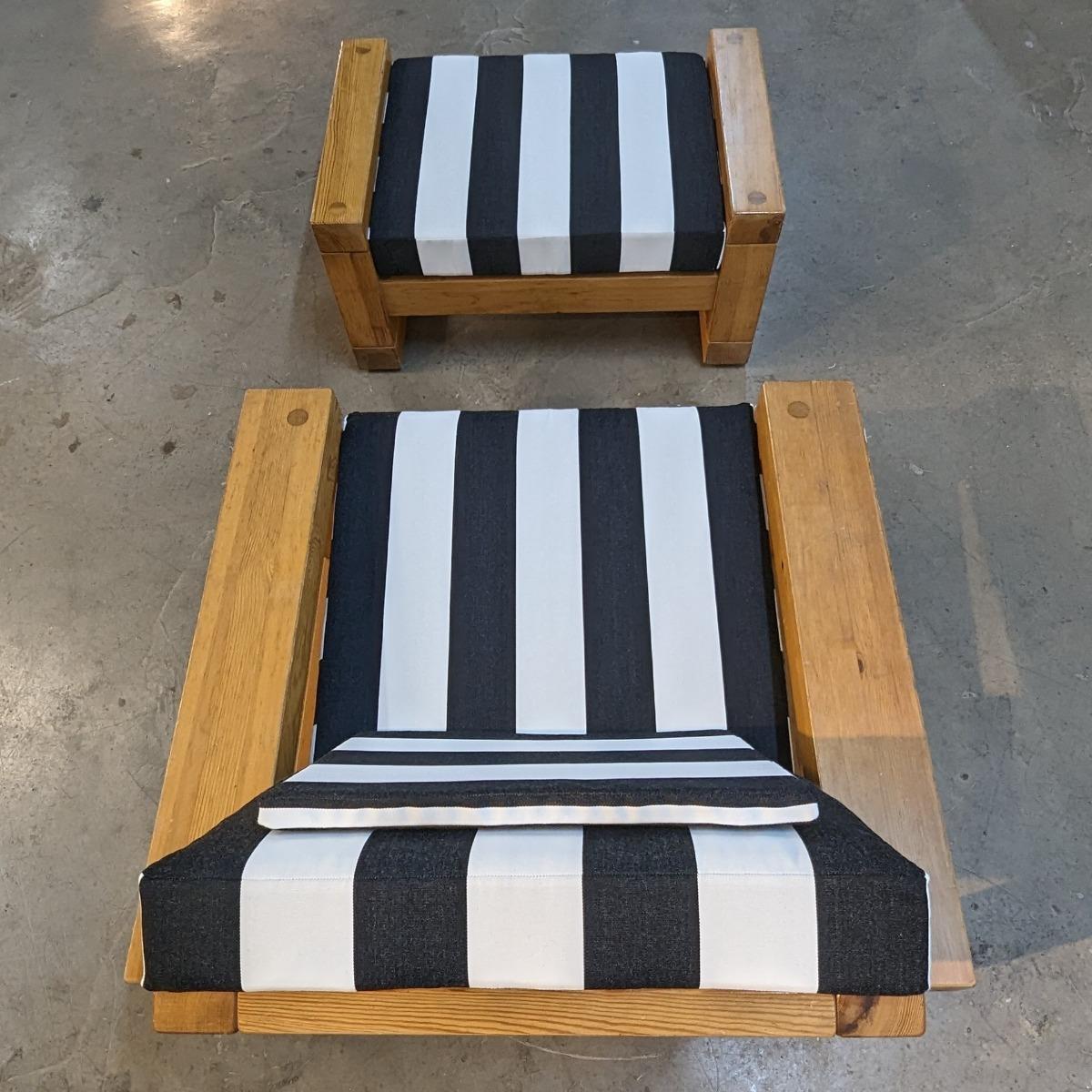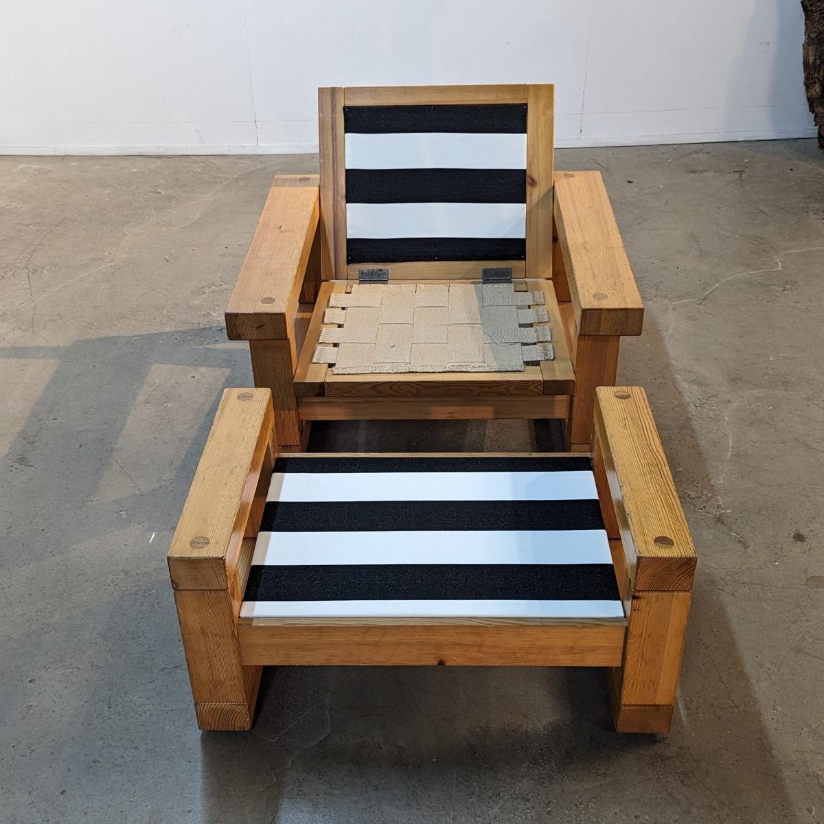 Fauteuil lounge au design scandinave, années 60. 2 positions d'assise. Avec un repose pieds. Coussins refait entièrement. Fauteuil : HD 70cm HA 37cm larg. 88cm prof. 79cm Ottoman : H37cm Long 80cm larg. 50cm